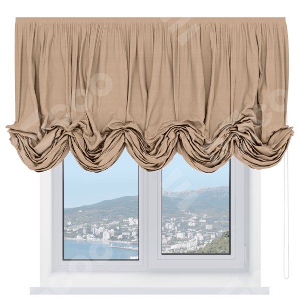 Австрийская штора производителя «Cortin», используется для проёма, пошита из ткани вельвет песочный, артикул ткани 17740. Имеет универсальный механизм и подходит для монтажа: на потолок и на стену.