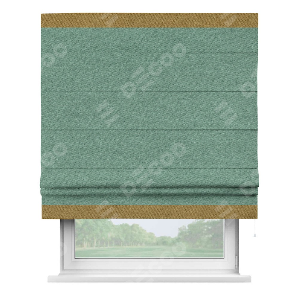 Римская штора производителя «Cortin», используется для проёма, пошита из ткани твид блэкаут бирюзовый, артикул 90934. Отделка шторы кантом «Горизонт», ткань для канта используется из твида разной расцветки на выбор. Имеет универсальный механизм и подходит для монтажа: на потолок, на стену и в нишу.