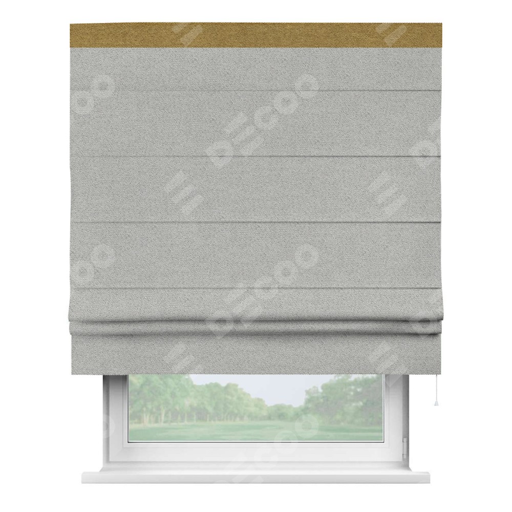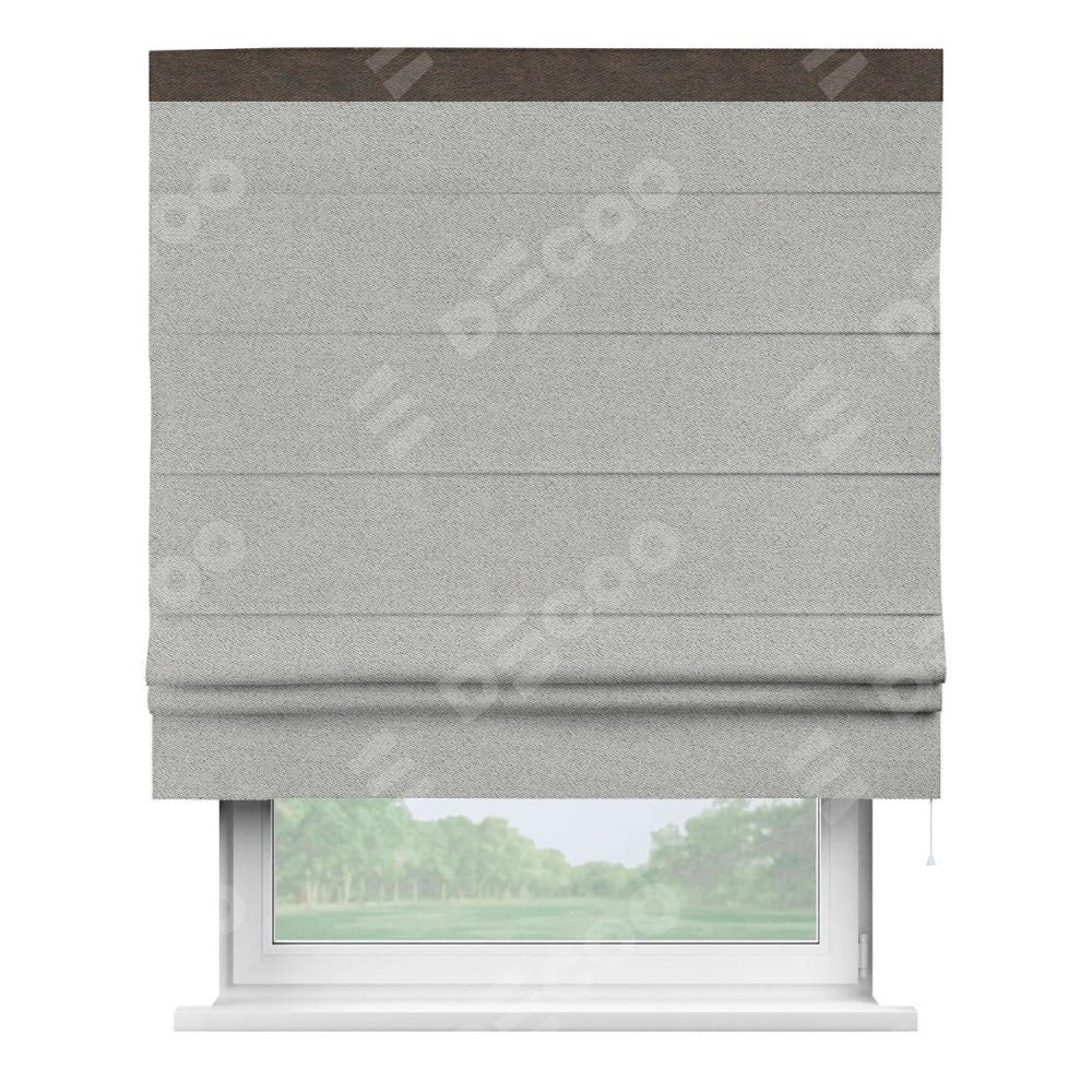 Римская штора производителя «Cortin», используется для проёма, пошита из ткани твид блэкаут светло-серый, артикул 90936. Отделка шторы кантом «Кинг», ткань для канта используется из твида разной расцветки на выбор. Имеет универсальный механизм и подходит для монтажа: на потолок, на стену и в нишу.