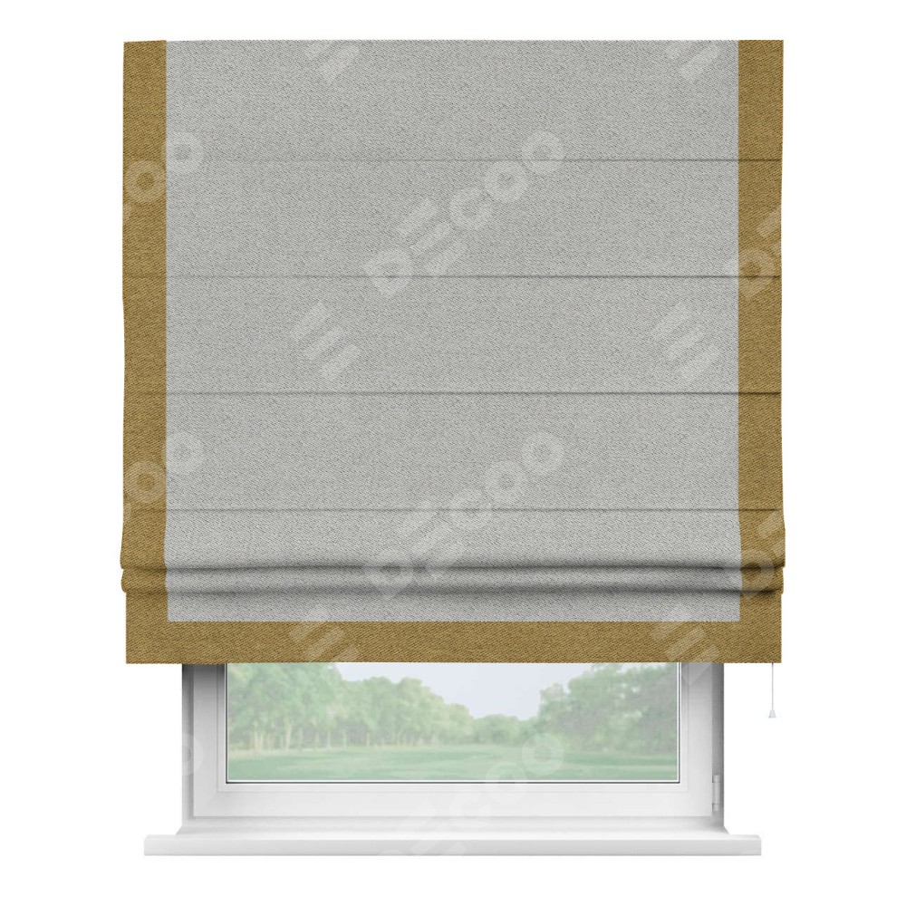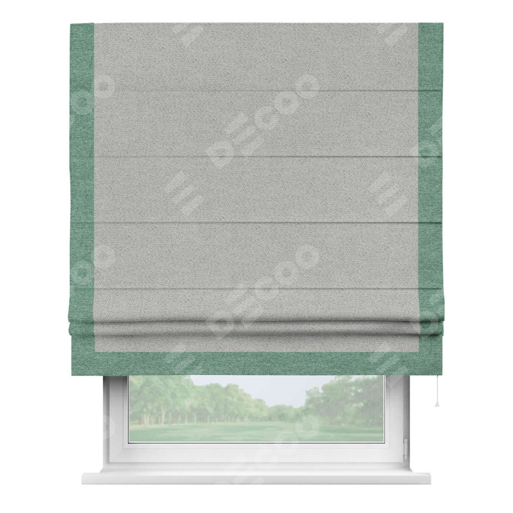 Римская штора производителя «Cortin», используется для проёма, пошита из ткани твид блэкаут светло-серый, артикул 90936. Отделка шторы кантом «Виктория», ткань для канта используется из твида разной расцветки на выбор. Имеет универсальный механизм и подходит для монтажа: на потолок, на стену и в нишу.