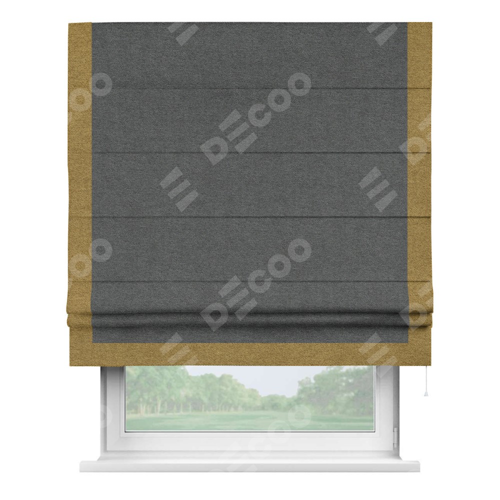 Римская штора производителя «Cortin», используется для проёма, пошита из ткани твид блэкаут тёмно-серый, артикул 90938. Отделка шторы кантом «Виктория», ткань для канта используется из твида разной расцветки на выбор. Имеет универсальный механизм и подходит для монтажа: на потолок, на стену и в нишу.