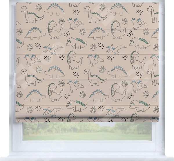 Римская штора производителя «Cortin», устанавливается на створку окна, пошита из ткани блэкаут с нанесением сублимационной печати «Динозаврики». Штора шьётся по индивидуальным размерам, для данного типа римской шторы возможная ширина от 35 до 150 см., высота до 250 см.