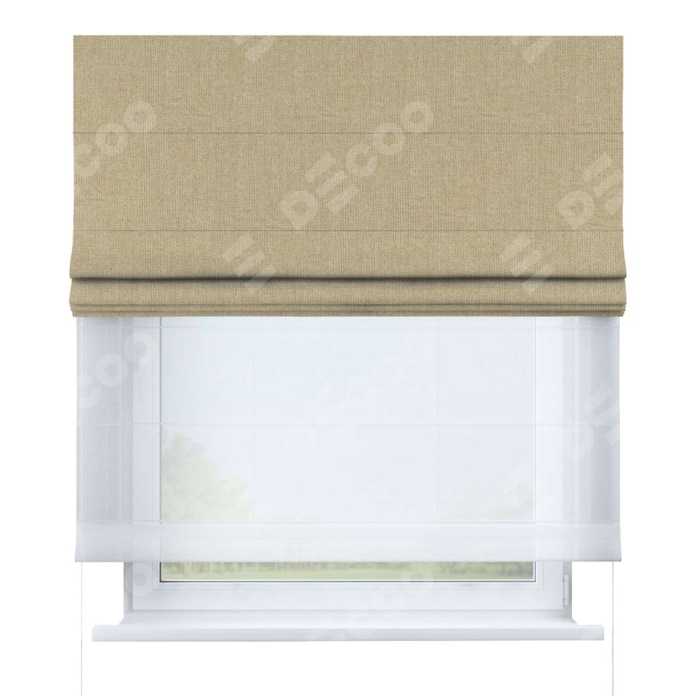 Двойная римская штора «День-ночь» от производителя Cortin предназначена для использования в проёмах. Эта штора уникальна тем, что состоит из двух полотен. На лицевой стороне находится лён димаут песочный (артикул: 16256), обеспечивающий эффективное затемнение. В комплект также входит вторая ткань — легкий белый тюль (артикул: V-01), который добавляет изящества и легкости оформлению окна. Кроме того, доступны и другие разновидности ткани тюль, выбор которых доступен по ссылке .