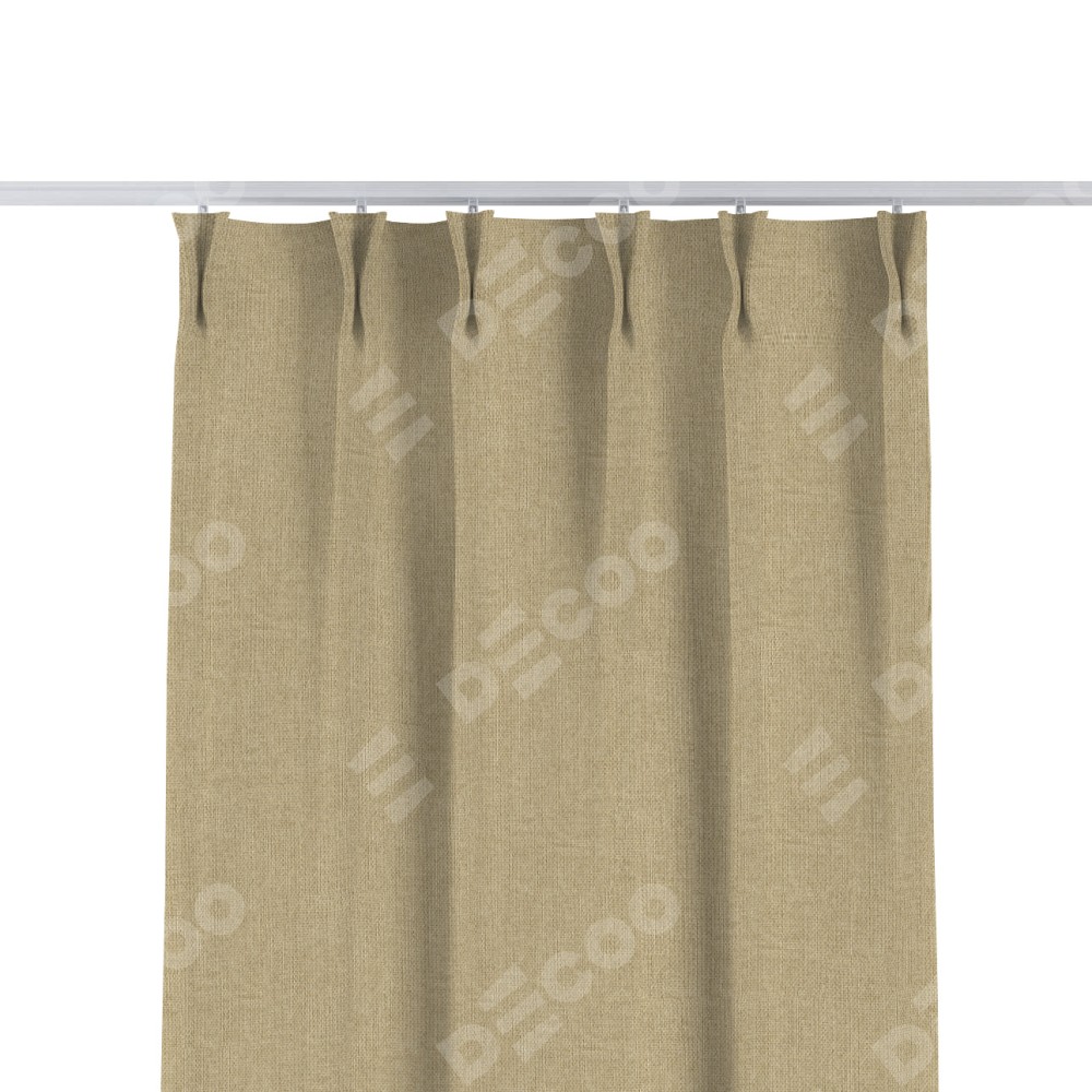 Комплект прямых штор, от производителя «Cortin», пошиты из ткани лён димаут песочный, артикул ткани 16256. С изнаночной стороны в верхней части штор пристрачивается шторная лента с декоративными складками «Кустик». Для создания элегантных складок прямые шторы шьются по стандарту с коэффициентом 1:2 (на 100 см. ширины проёма 200 см. ширины ткани).