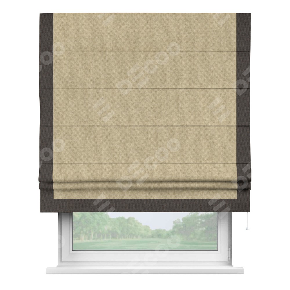 Римская штора с отделкой кантом «Виктория», пошита из ткани лён димаут песочный, артикул: 16256. представляет собой элегантное решение для оконного оформления. Кант по бокам и снизу шторы добавляет изысканности и аккуратности внешнему виду, подчеркивая линии и форму шторы. Этот элемент декора не только украшает, но и выполняет практическую функцию, защищая края ткани от износа. Кант может быть выполнен в контрастном или гармонирующем цвете, что позволяет добиться различных стилевых эффектов и легко вписать штору в интерьер комнаты.