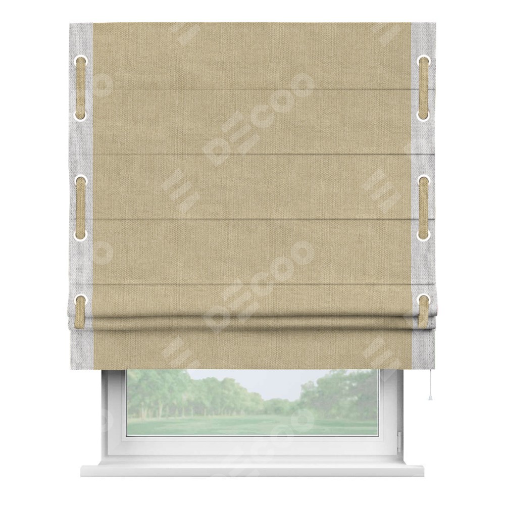 Римская штора пошита из ткани лён димаут песочный, артикул: 16256, с отделкой кантом «Стрим Дуо», дополненная декоративными люверсами на этих кантах и протянутым пояском из основного цвета римской шторы, представляет собой высоко декоративное и функциональное решение для оконного оформления. Канты, расположенные по обеим боковым сторонам шторы, уже добавляют изысканности и завершенности внешнему виду. Добавление люверсов и пояска не только усиливает декоративный эффект, но и придает шторе дополнительную текстурность и глубину.
