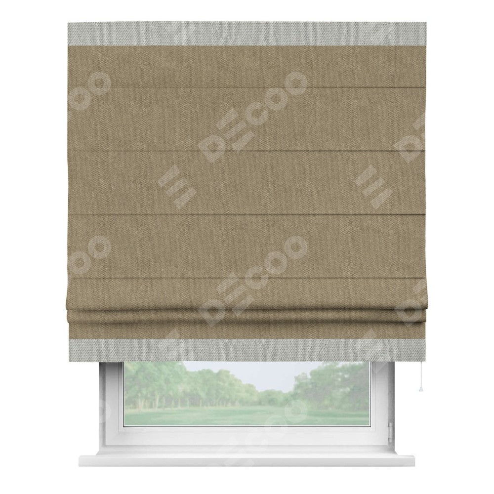 Римская штора пошита из ткани лён димаут тёмно-бежевый, артикул: 16261, с отделкой кантом «Горизонт» предлагает уникальное дизайнерское решение, при котором кант располагается только вверху и снизу шторы. Такое решение делает акцент на горизонтальных линиях, визуально расширяя пространство и придавая окну более строгий и организованный вид. Отделка кантом в этих ключевых местах не только украшает штору, но и способствует её долговечности, защищая наиболее уязвимые к износу края.