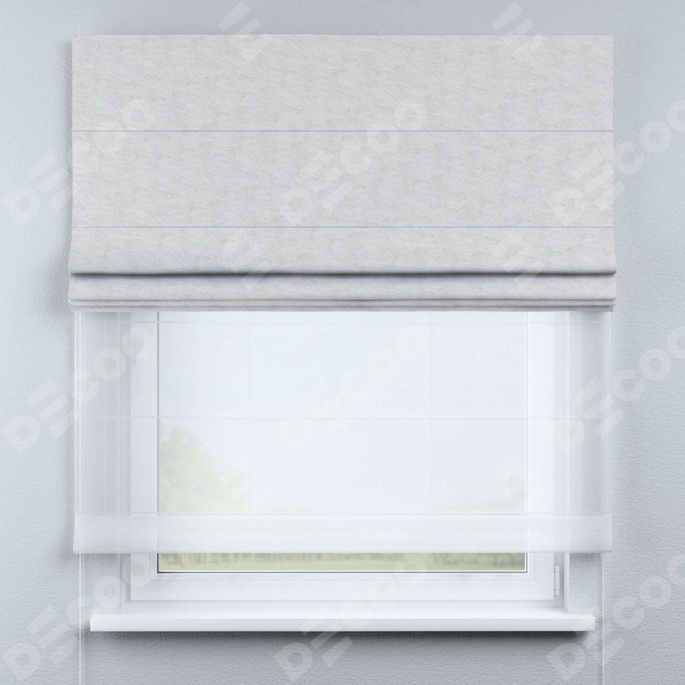 Двойная римская штора «День-ночь» от производителя Cortin предназначена для использования в проёмах. Эта штора уникальна тем, что состоит из двух полотен. На лицевой стороне находится софт мрамор белый (артикул: 93581), обеспечивающий эффективное затемнение. В комплект также входит вторая ткань — легкий белый тюль (артикул: V-01), который добавляет изящества и легкости оформлению окна. Кроме того, доступны и другие разновидности ткани тюль, выбор которых доступен по  ссылке .