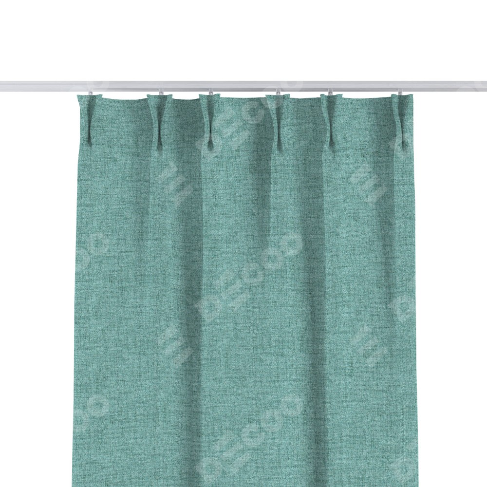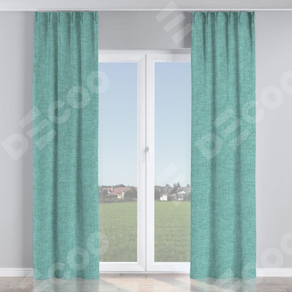 Комплект прямых штор, от производителя «Cortin», пошиты из ткани рогожка димаут аквамариновый крайола, артикул ткани 91023. С изнаночной стороны в верхней части штор пристрачивается шторная лента с декоративными складками «Кустик». Для создания элегантных складок прямые шторы шьются по стандарту с коэффициентом 1:2 (на 100 см. ширины проёма 200 см. ширины ткани).