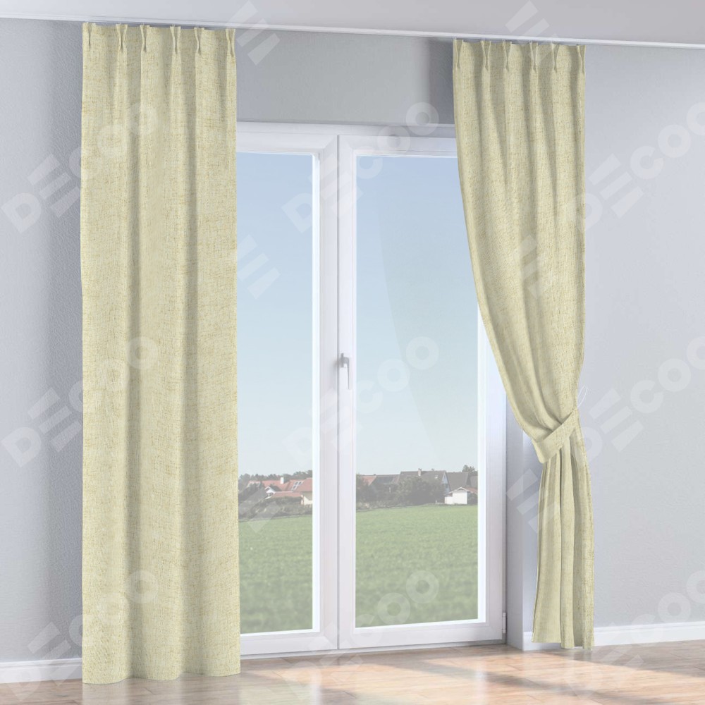 Комплект прямых штор, от производителя «Cortin», пошиты из ткани рогожка димаут золотой песок, артикул ткани 91015. С изнаночной стороны в верхней части штор пристрачивается шторная лента с декоративными складками «Кустик». Для создания элегантных складок прямые шторы шьются по стандарту с коэффициентом 1:2 (на 100 см. ширины проёма 200 см. ширины ткани).