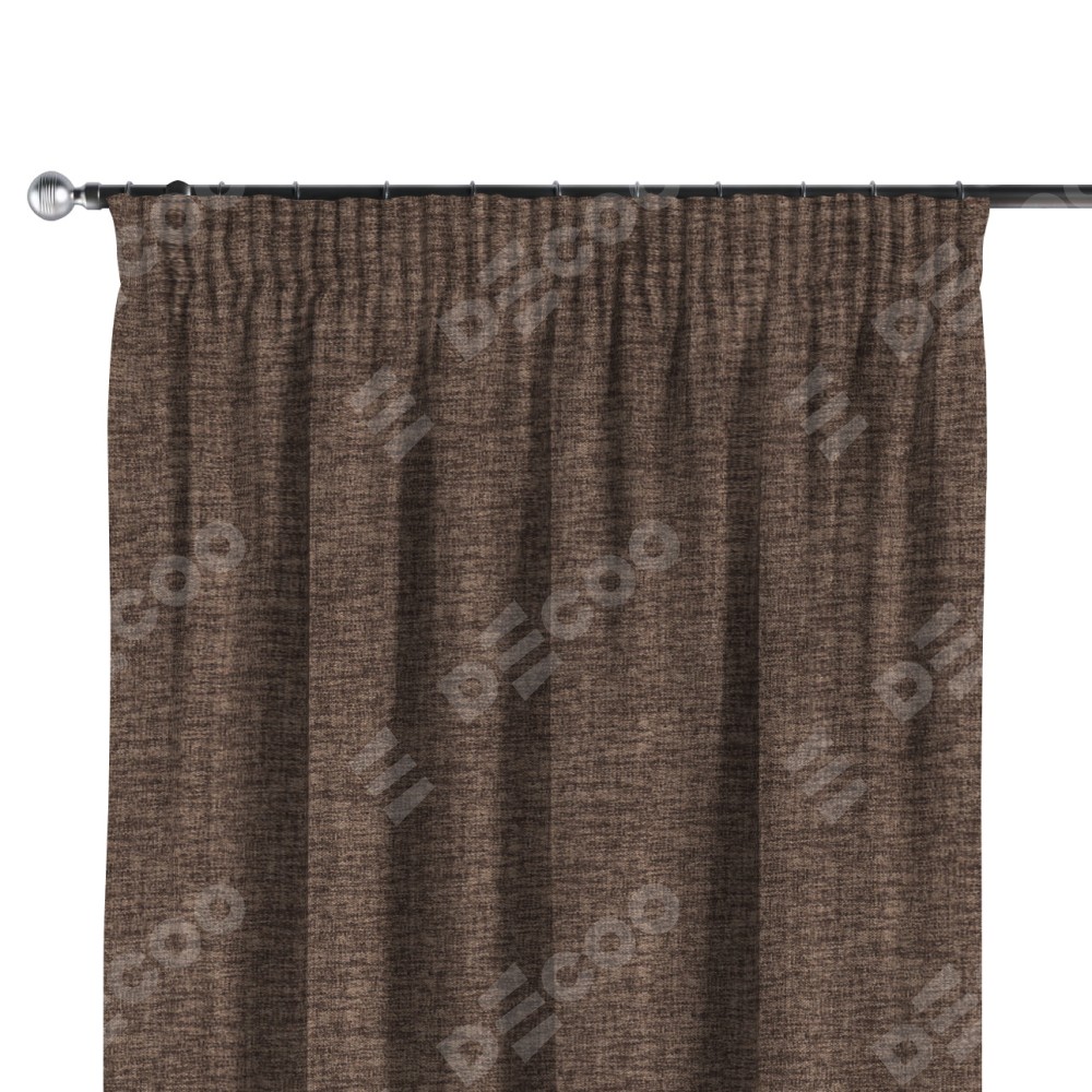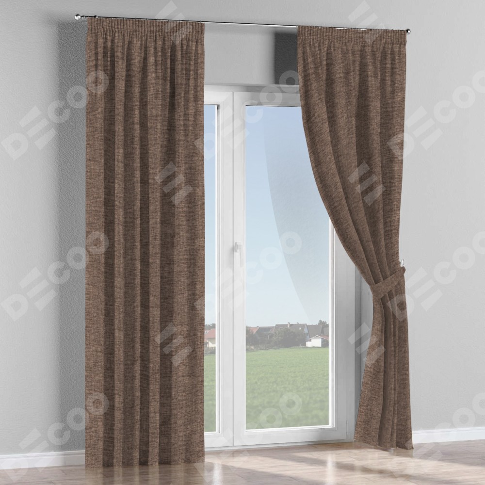 Комплект прямых штор, от производителя «Cortin», пошиты из ткани рогожка димаут коричневый, артикул ткани 91018. С изнаночной стороны в верхней части штор пристрачивается шторная лента с декоративными складками «Карандаш». Для создания элегантных складок прямые шторы шьются по стандарту с коэффициентом 1:2 (на 100 см. ширины проёма 200 см. ширины ткани).