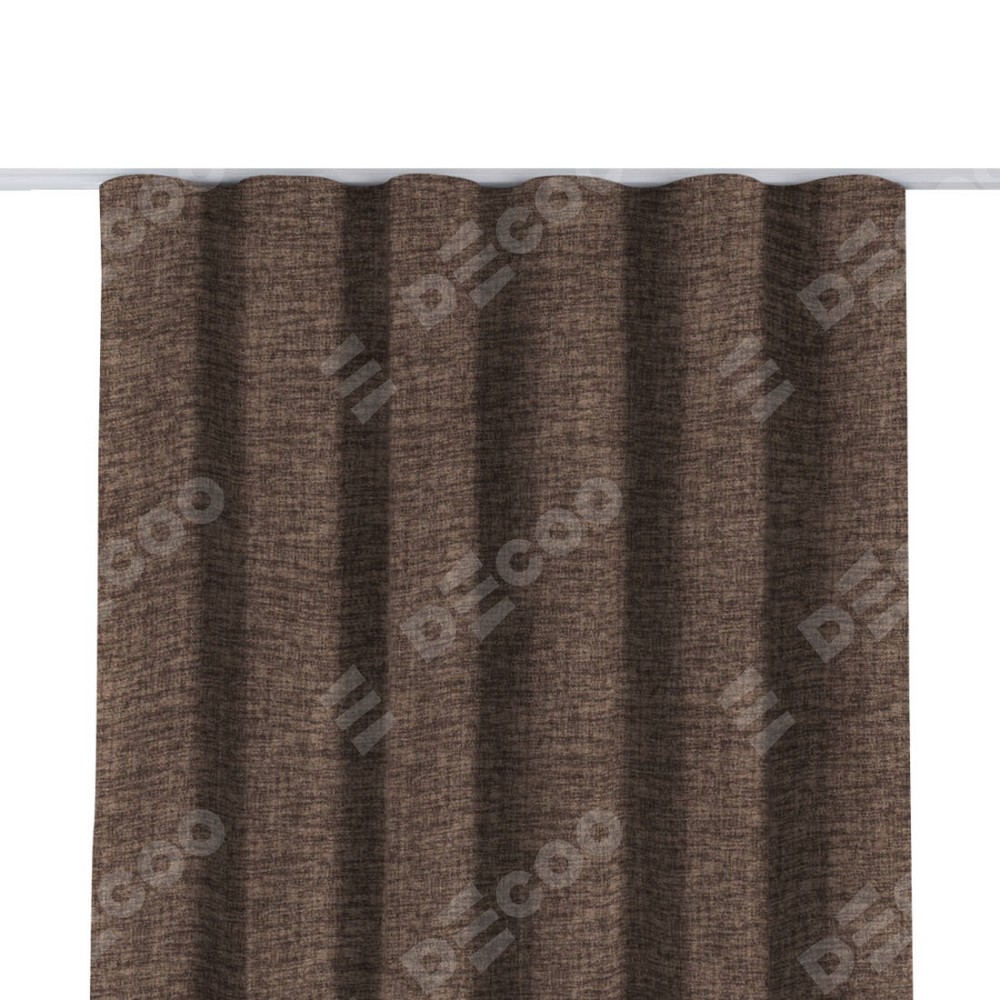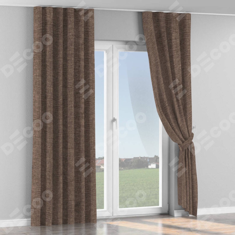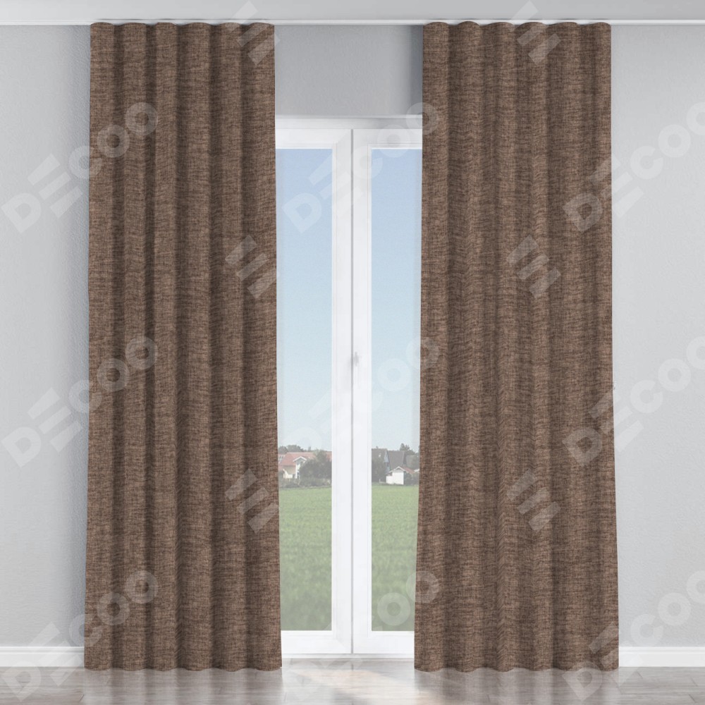 Комплект прямых штор, от производителя «Cortin», пошиты из ткани рогожка димаут коричневый, артикул ткани 91018. С изнаночной стороны в верхней части штор пристрачивается шторная лента с декоративными складками «Волна». Для создания элегантных складок прямые шторы шьются по стандарту с коэффициентом 1:2 (на 100 см. ширины проёма 200 см. ширины ткани).