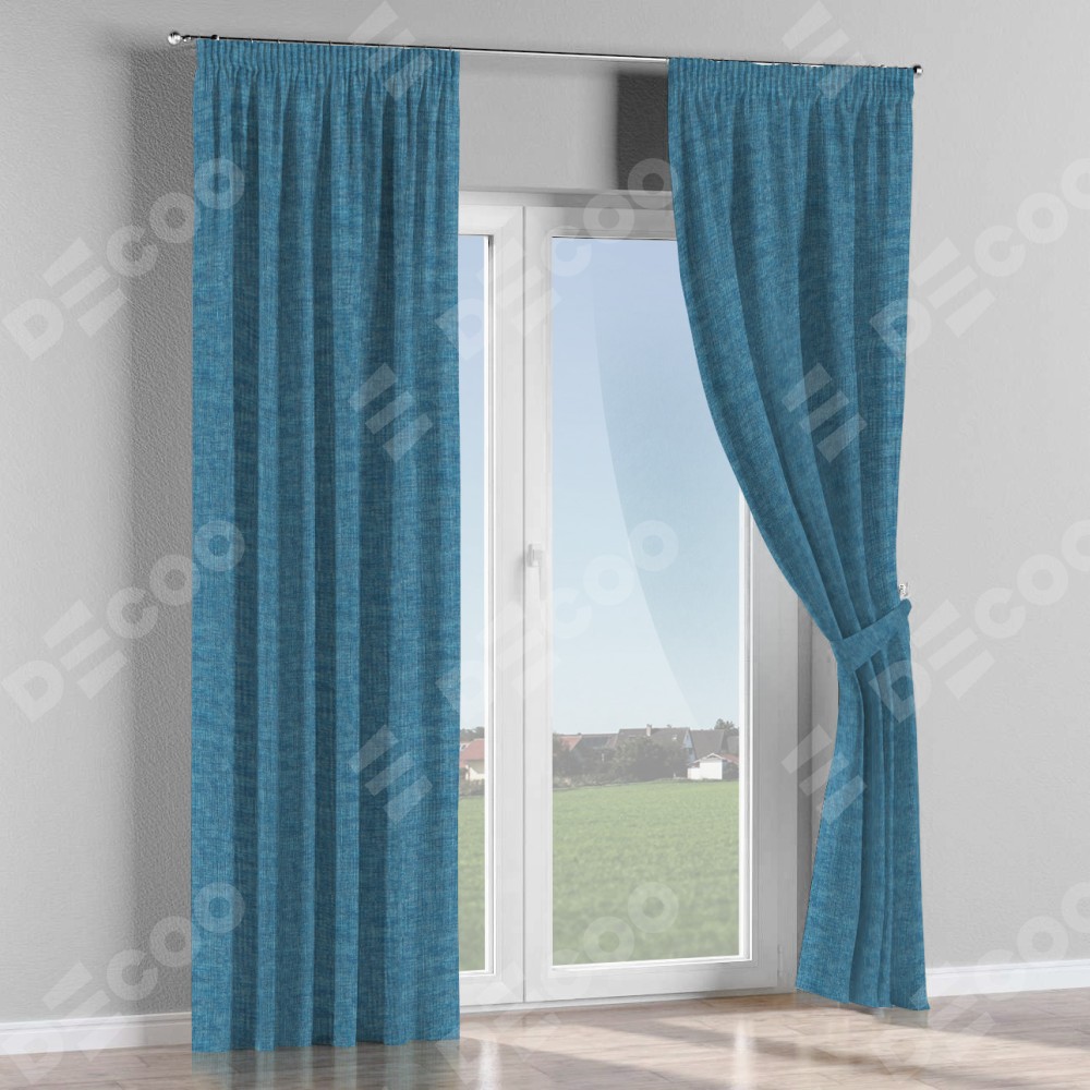 Комплект прямых штор, от производителя «Cortin», пошиты из ткани рогожка димаут лазурно-синий, артикул ткани 91024. С изнаночной стороны в верхней части штор пристрачивается шторная лента с декоративными складками «Карандаш». Для создания элегантных складок прямые шторы шьются по стандарту с коэффициентом 1:2 (на 100 см. ширины проёма 200 см. ширины ткани).