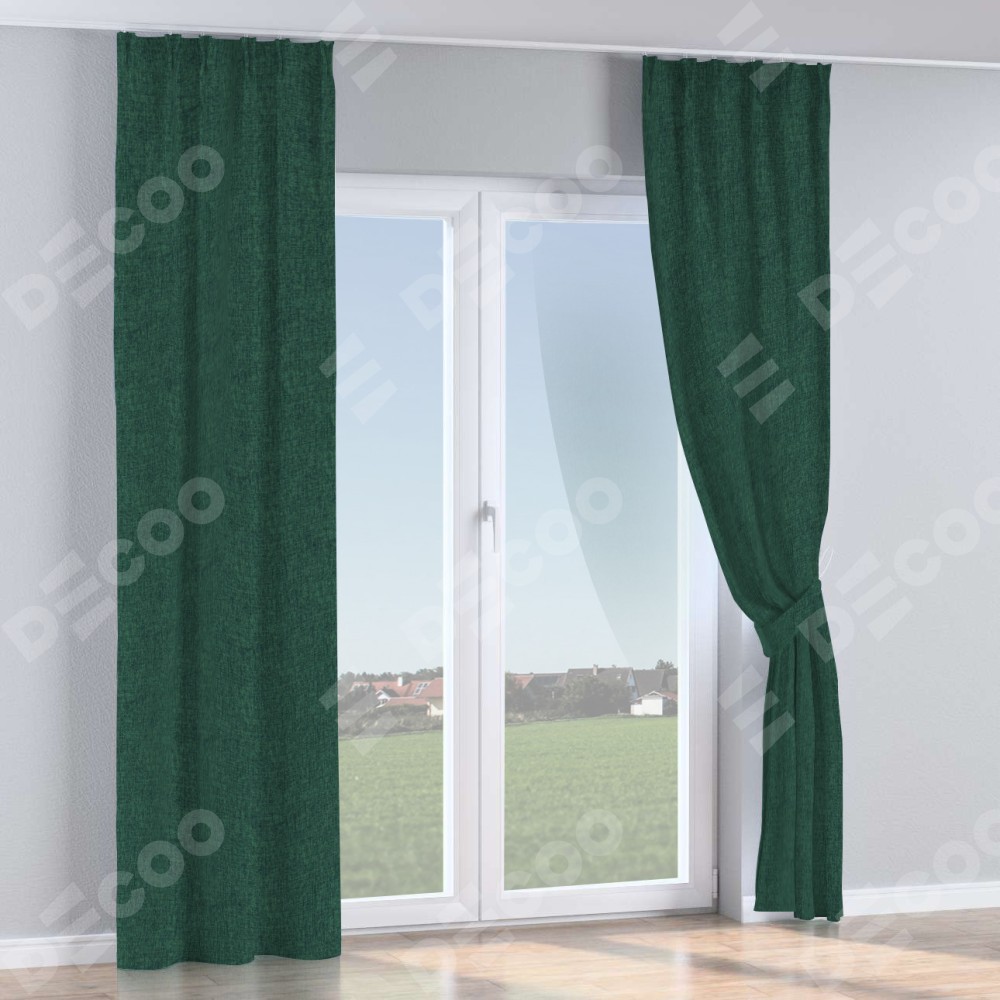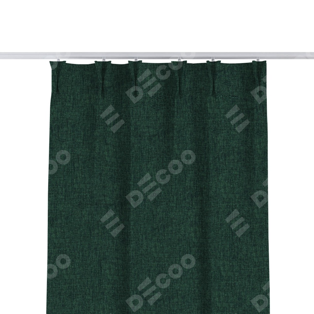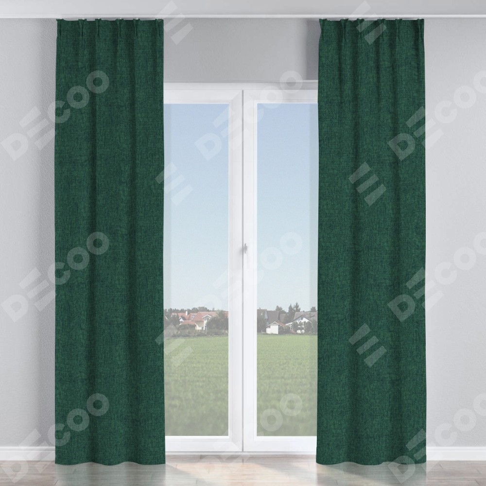 Комплект прямых штор, от производителя «Cortin», пошиты из ткани рогожка димаут тёмно-зелёный, артикул ткани 91022. С изнаночной стороны в верхней части штор пристрачивается шторная лента с декоративными складками «Кустик». Для создания элегантных складок прямые шторы шьются по стандарту с коэффициентом 1:2 (на 100 см. ширины проёма 200 см. ширины ткани).