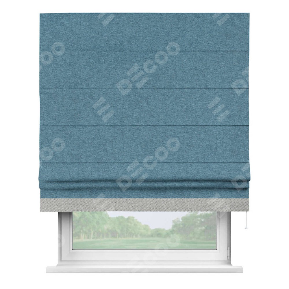 Римская штора пошита из ткани твид блэкаут светло-синий, артикул: 90935, с отделкой кантом «Джестер» выделяется своей уникальной особенностью — кантом, расположенным только снизу шторы. Этот дизайн добавляет оригинальности и игривости оконному оформлению, делая акцент на нижней части шторы и создавая интересный визуальный эффект. Отделка кантом на нижнем крае не только служит эстетической функции, но и способствует увеличению прочности и износостойкости ткани в этом месте.