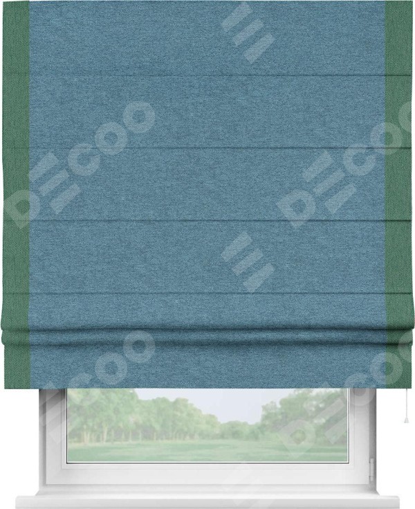 Римская штора пошита из ткани твид блэкаут светло-синий, артикул: 90935, с отделкой кантом «Стрим Дуо» выделяется наличием кантов по обоим бокам шторы, слева и справа. Этот дизайн придает шторе аккуратный и завершенный вид, акцентируя вертикальные линии и визуально вытягивая окно в высоту. Отделка кантом по бокам не только украшает штору, но и служит практической функцией, укрепляя края и продлевая срок службы изделия.