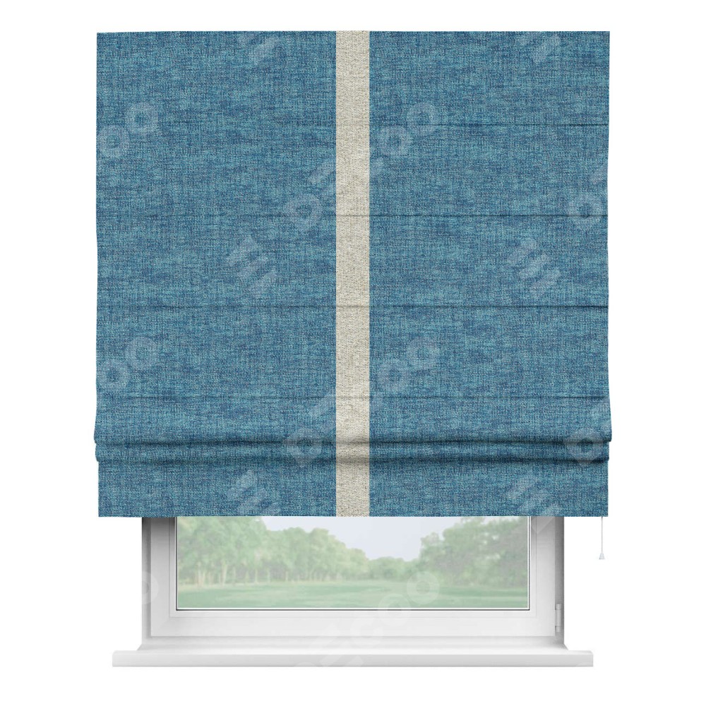 Римская штора пошита из ткани рогожка димаут лазурно-синий, артикул: 91024, с отделкой кантом «Хайвэй» представляет собой уникальное и смелое дизайнерское решение, где кант расположен вертикально посередине шторы. Этот дизайн не только выделяет штору среди других вариантов оформления окон, но и создает интересный визуальный акцент, привлекая внимание к центру окна и разделяя штору на визуальные зоны. Такой нестандартный подход добавляет динамичности интерьеру и может быть использован для подчеркивания особенностей оформления помещения.