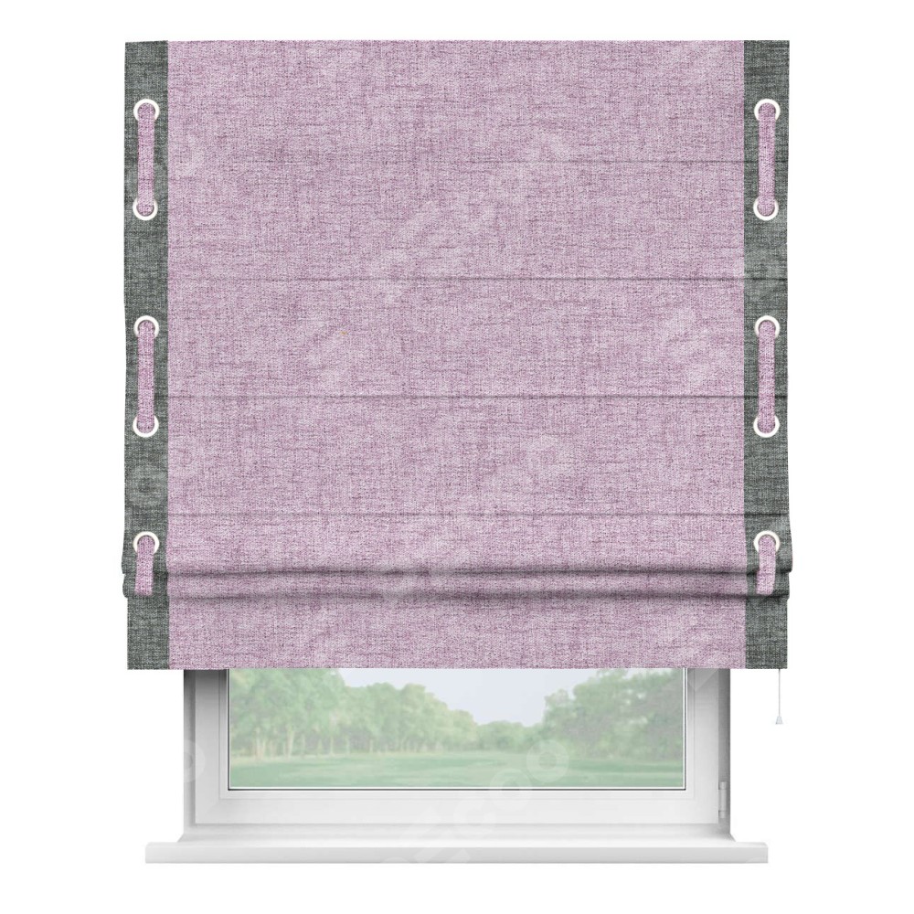 Римская штора «Кортин» для проёма, рогожка димаут розовый, с кантом Стрим Дуо (люверсы с пояском)