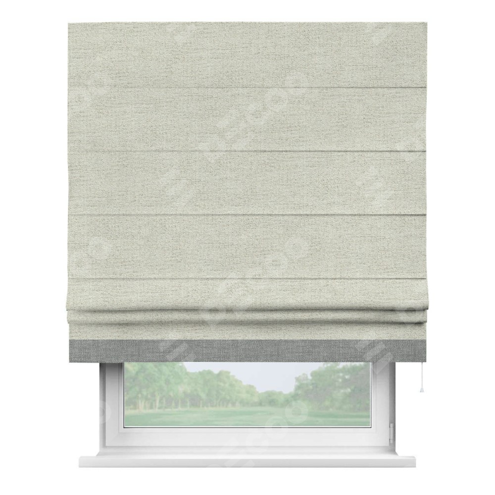 Римская штора пошита из ткани рогожка димаут серо-бежевый, артикул: 91014, с отделкой кантом «Джестер» выделяется своей уникальной особенностью — кантом, расположенным только снизу шторы. Этот дизайн добавляет оригинальности и игривости оконному оформлению, делая акцент на нижней части шторы и создавая интересный визуальный эффект. Отделка кантом на нижнем крае не только служит эстетической функции, но и способствует увеличению прочности и износостойкости ткани в этом месте.