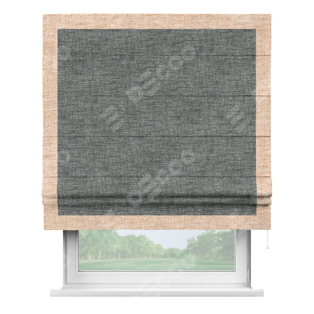 Римская штора пошита из ткани рогожка димаут тёмно-серый, артикул: 91029, с отделкой кантом «Чесс» отличается своей уникальной деталью — наличием канта не только по бокам и снизу, но и сверху по всем краям шторы. Это придает шторе особенно аккуратный и завершенный вид, делая акцент на границах и форме шторы. Отделка кантом по всему периметру шторы усиливает её декоративные качества и подчеркивает строгую геометрию, что может быть особенно актуально для современных и минималистичных интерьеров.