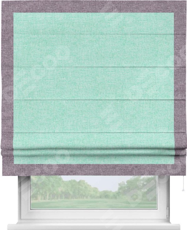 Римская штора пошита из ткани лён кашемир мятный, артикул: 21617, с отделкой кантом «Чесс» отличается своей уникальной деталью — наличием канта не только по бокам и снизу, но и сверху по всем краям шторы. Это придает шторе особенно аккуратный и завершенный вид, делая акцент на границах и форме шторы. Отделка кантом по всему периметру шторы усиливает её декоративные качества и подчеркивает строгую геометрию, что может быть особенно актуально для современных и минималистичных интерьеров.