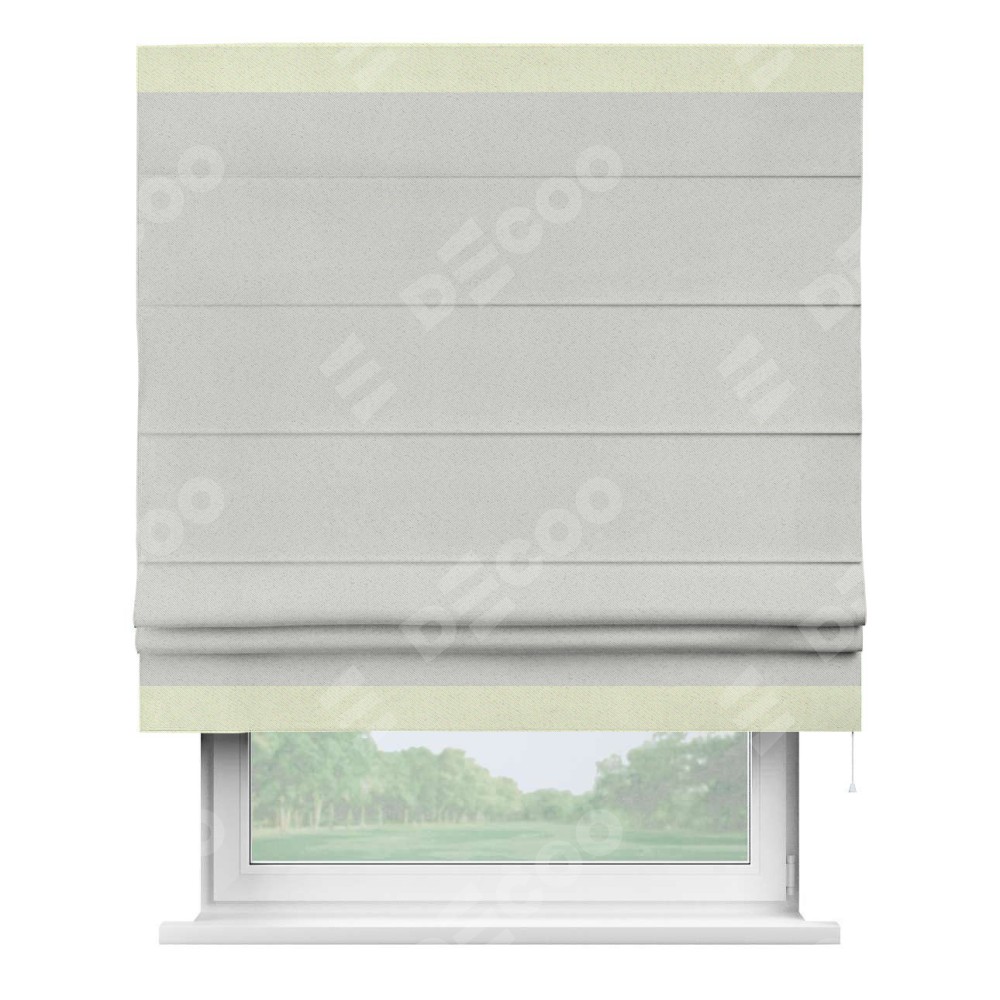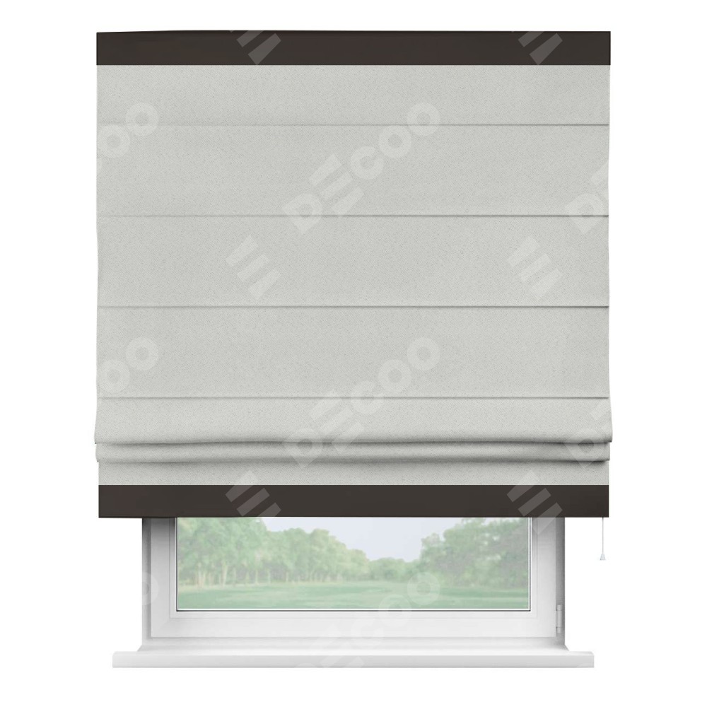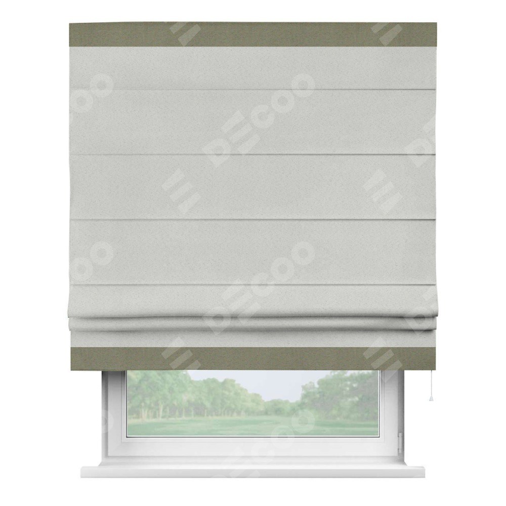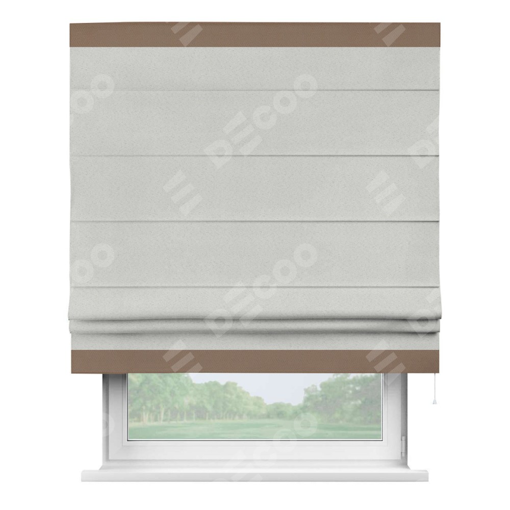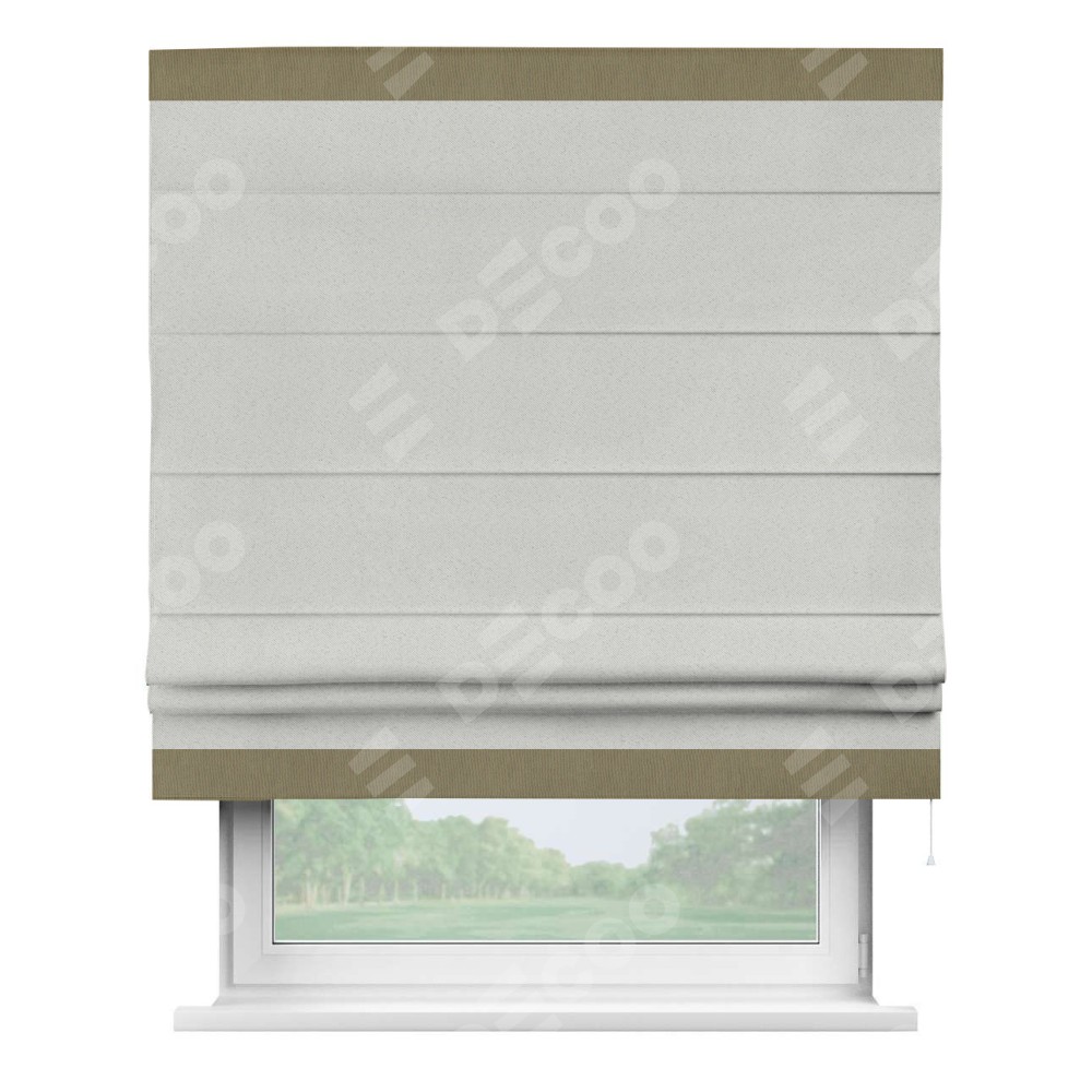 Римская штора пошита из ткани однотонный блэкаут милк, артикул: 23, с отделкой кантом «Горизонт» предлагает уникальное дизайнерское решение, при котором кант располагается только вверху и снизу шторы. Такое решение делает акцент на горизонтальных линиях, визуально расширяя пространство и придавая окну более строгий и организованный вид. Отделка кантом в этих ключевых местах не только украшает штору, но и способствует её долговечности, защищая наиболее уязвимые к износу края.