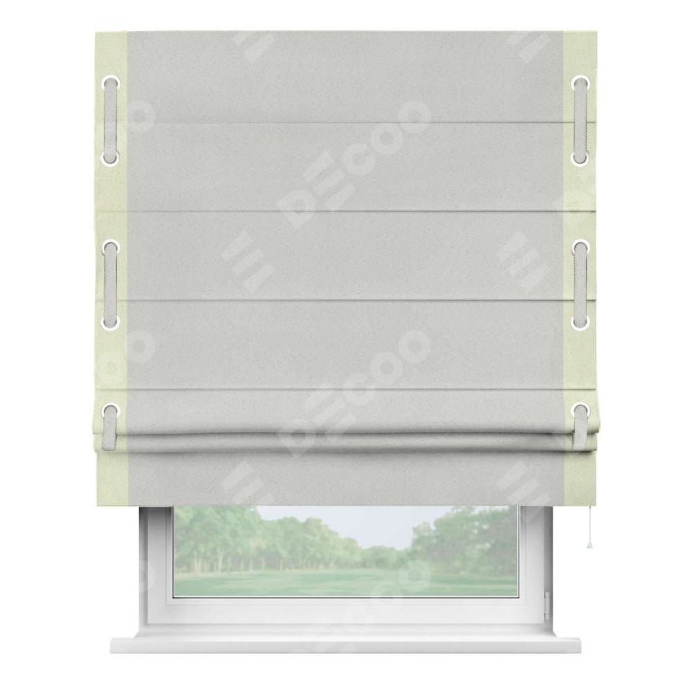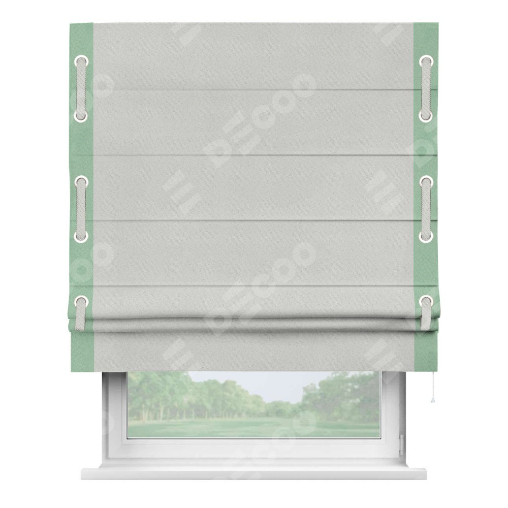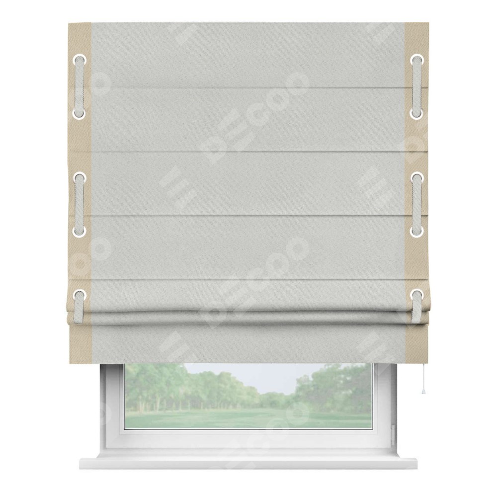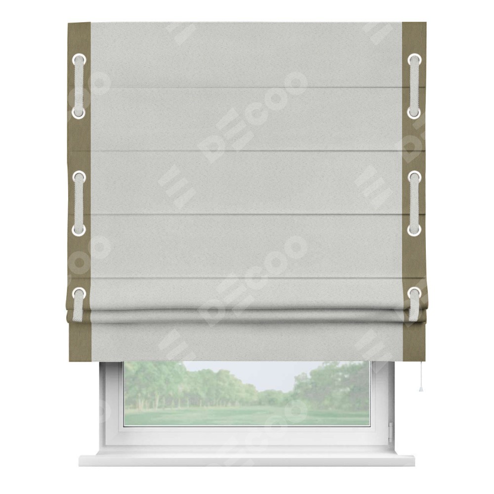 Декоративные люверсы на кантах могут выполнять как чисто украшательную функцию, так и быть частью механизма для протягивания декоративного пояска, что добавляет изделию уникальности и игривости. Поясок из основного цвета римской шторы, протянутый через люверсы, не только укрепляет вертикальную композицию, но и позволяет создавать различные драпировки, регулируя внешний вид шторы по желанию.