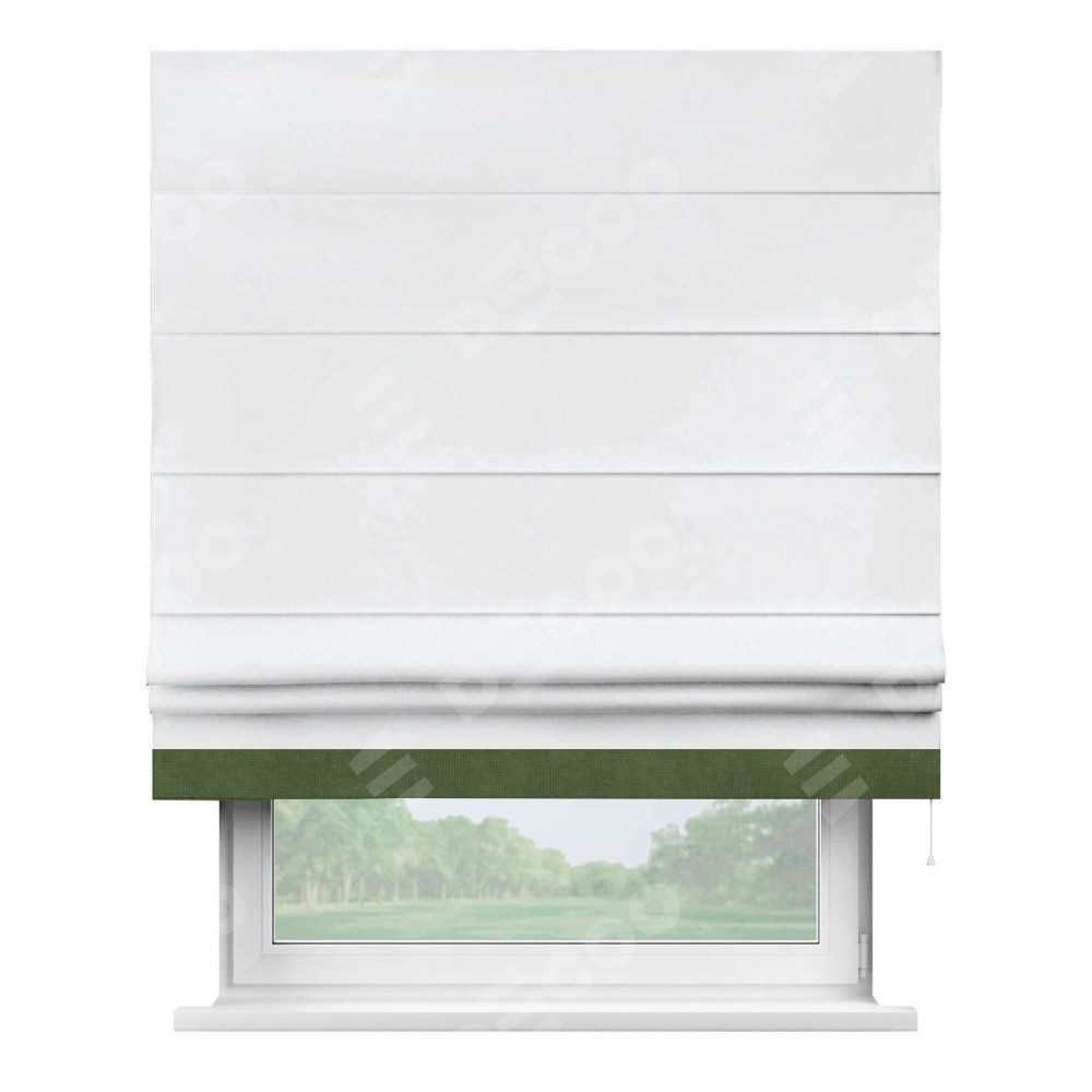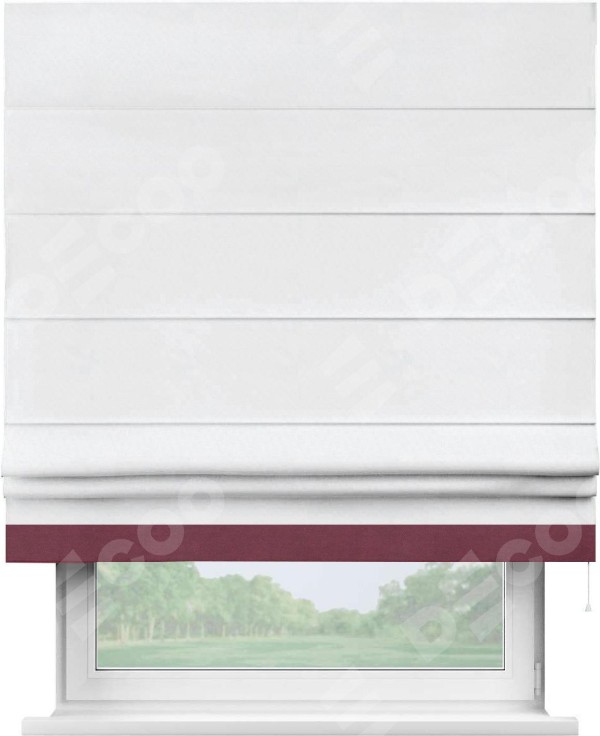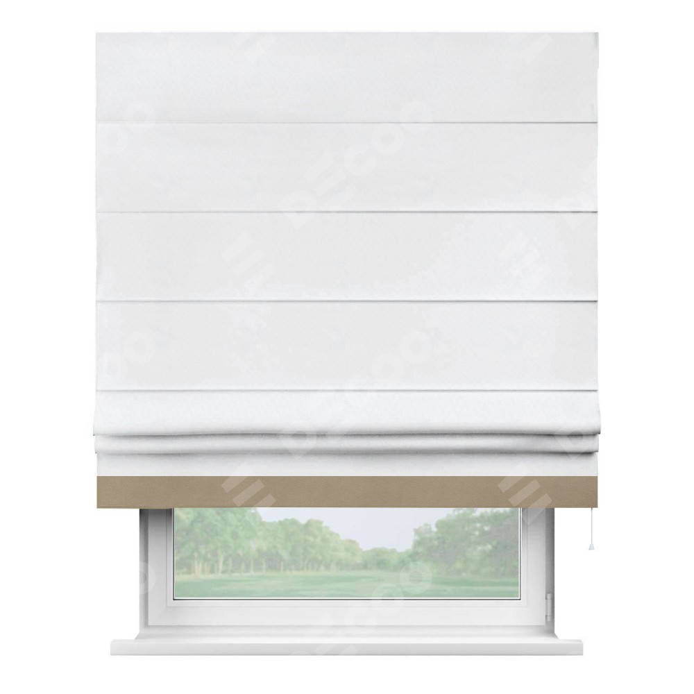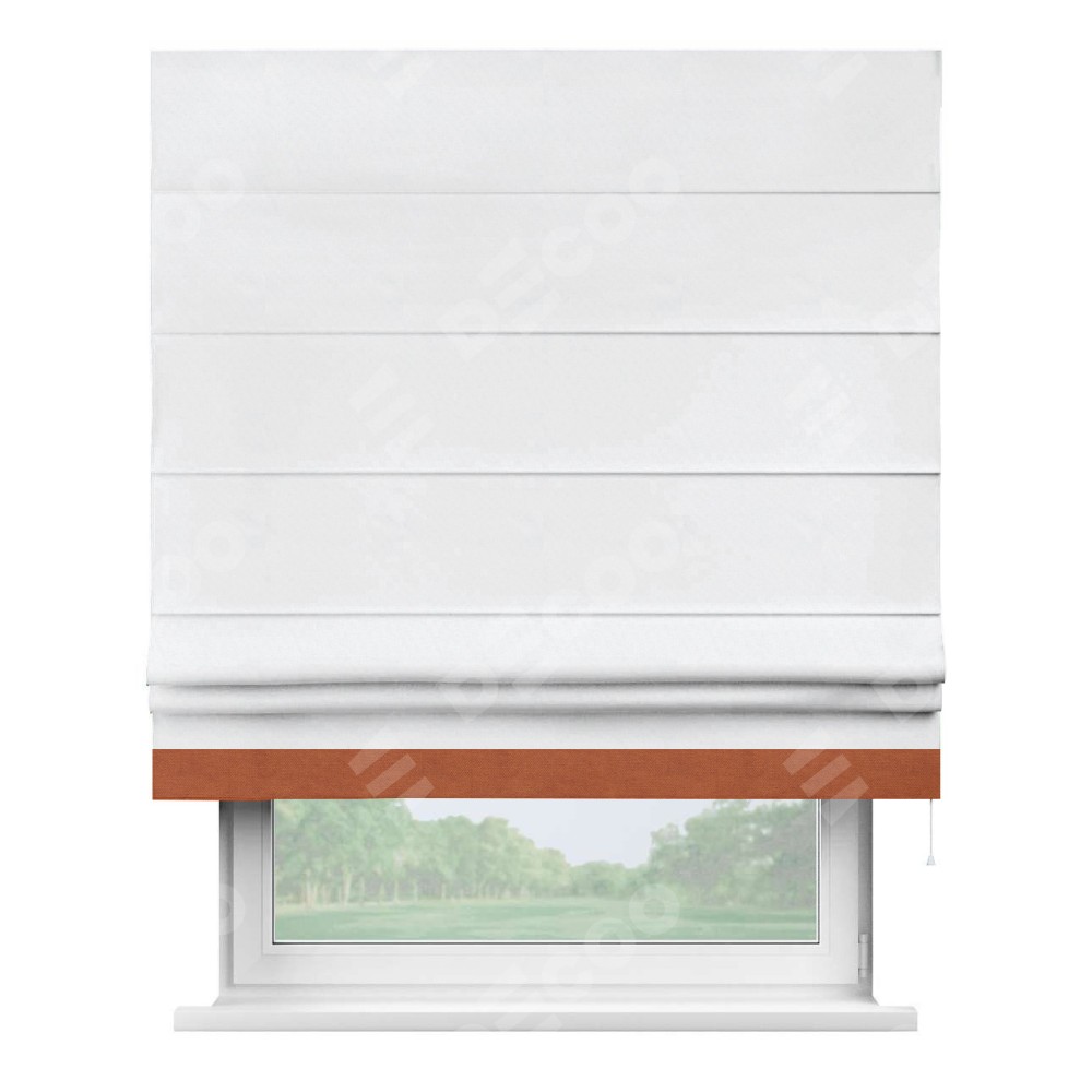 Римская штора пошита из ткани вельвет белоснежный, артикул: 92698, с отделкой кантом «Джестер» выделяется своей уникальной особенностью — кантом, расположенным только снизу шторы. Этот дизайн добавляет оригинальности и игривости оконному оформлению, делая акцент на нижней части шторы и создавая интересный визуальный эффект. Отделка кантом на нижнем крае не только служит эстетической функции, но и способствует увеличению прочности и износостойкости ткани в этом месте.