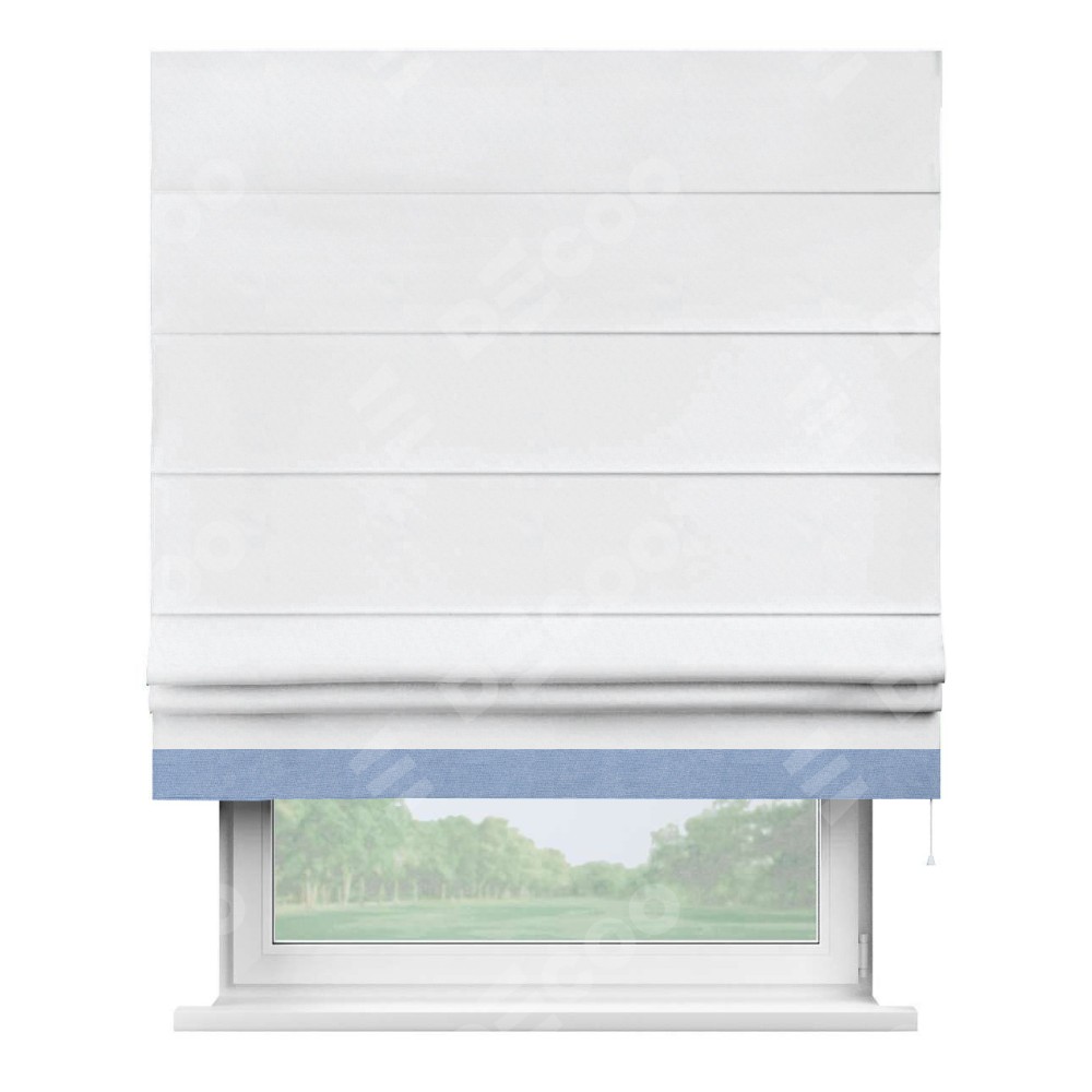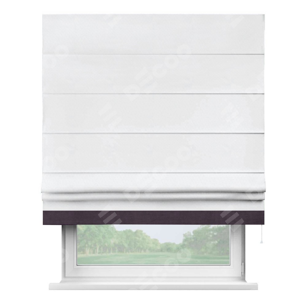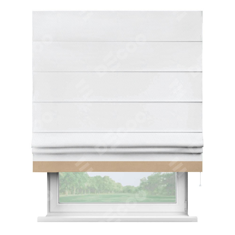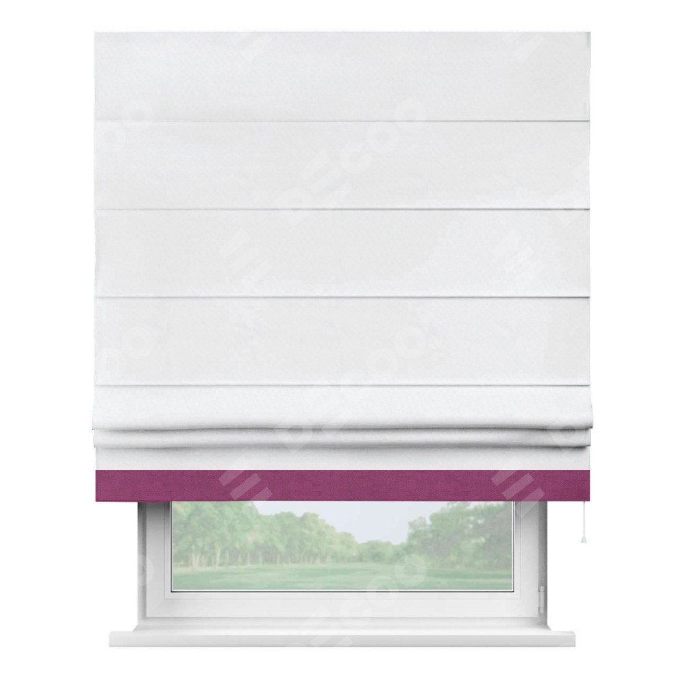 Римская штора пошита из ткани вельвет белоснежный, артикул: 92698, с отделкой кантом «Джестер» выделяется своей уникальной особенностью — кантом, расположенным только снизу шторы. Этот дизайн добавляет оригинальности и игривости оконному оформлению, делая акцент на нижней части шторы и создавая интересный визуальный эффект. Отделка кантом на нижнем крае не только служит эстетической функции, но и способствует увеличению прочности и износостойкости ткани в этом месте.