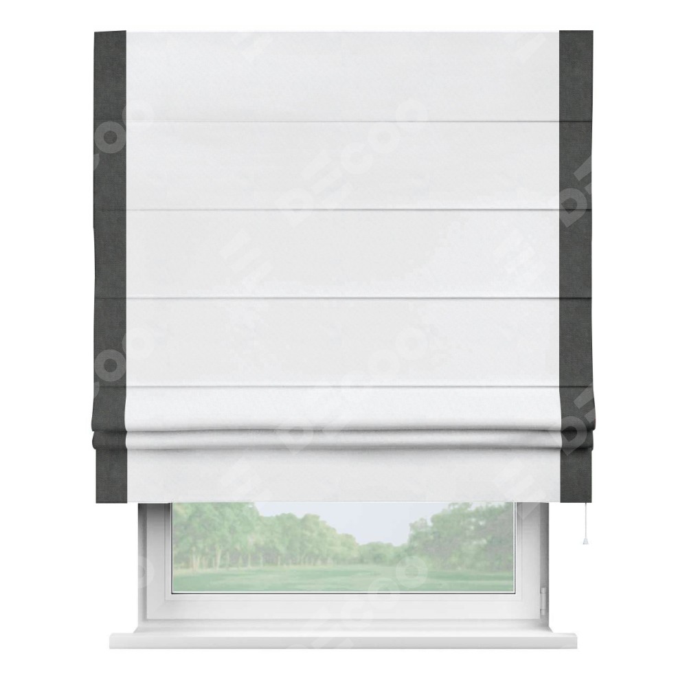 Римская штора пошита из ткани вельвет белоснежный, артикул: 92698, с отделкой кантом «Стрим Дуо» выделяется наличием кантов по обоим бокам шторы, слева и справа. Этот дизайн придает шторе аккуратный и завершенный вид, акцентируя вертикальные линии и визуально вытягивая окно в высоту. Отделка кантом по бокам не только украшает штору, но и служит практической функцией, укрепляя края и продлевая срок службы изделия.