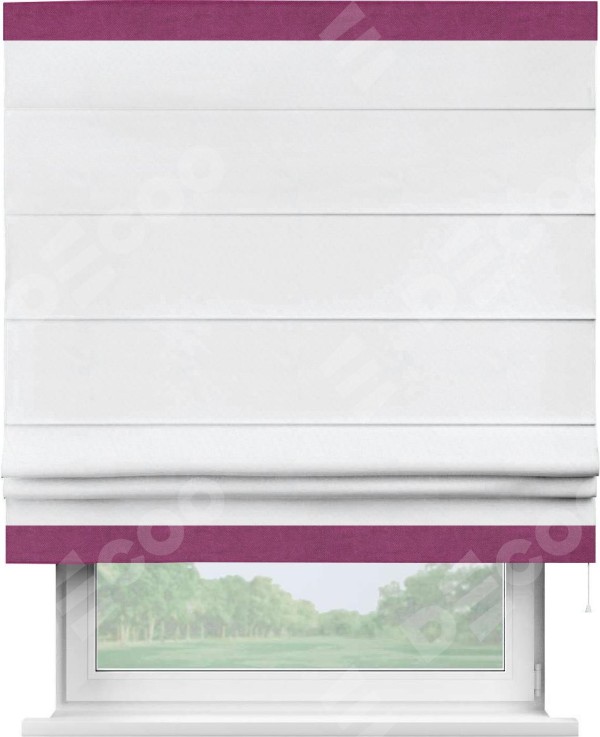 Римская штора пошита из ткани вельвет белоснежный, артикул: 92698, с отделкой кантом «Горизонт» предлагает уникальное дизайнерское решение, при котором кант располагается только вверху и снизу шторы. Такое решение делает акцент на горизонтальных линиях, визуально расширяя пространство и придавая окну более строгий и организованный вид. Отделка кантом в этих ключевых местах не только украшает штору, но и способствует её долговечности, защищая наиболее уязвимые к износу края.
