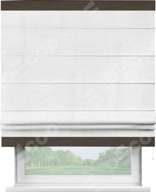 Римская штора пошита из ткани лён белоснежный, артикул: 95632, с отделкой кантом «Горизонт» предлагает уникальное дизайнерское решение, при котором кант располагается только вверху и снизу шторы. Такое решение делает акцент на горизонтальных линиях, визуально расширяя пространство и придавая окну более строгий и организованный вид. Отделка кантом в этих ключевых местах не только украшает штору, но и способствует её долговечности, защищая наиболее уязвимые к износу края.