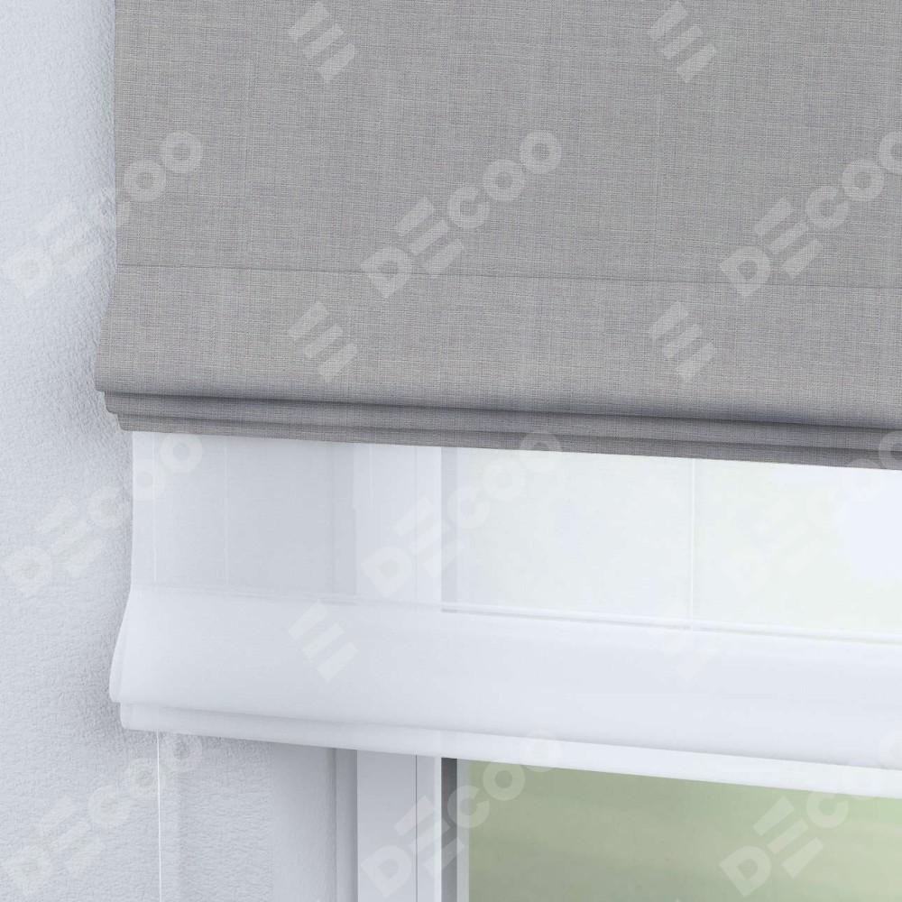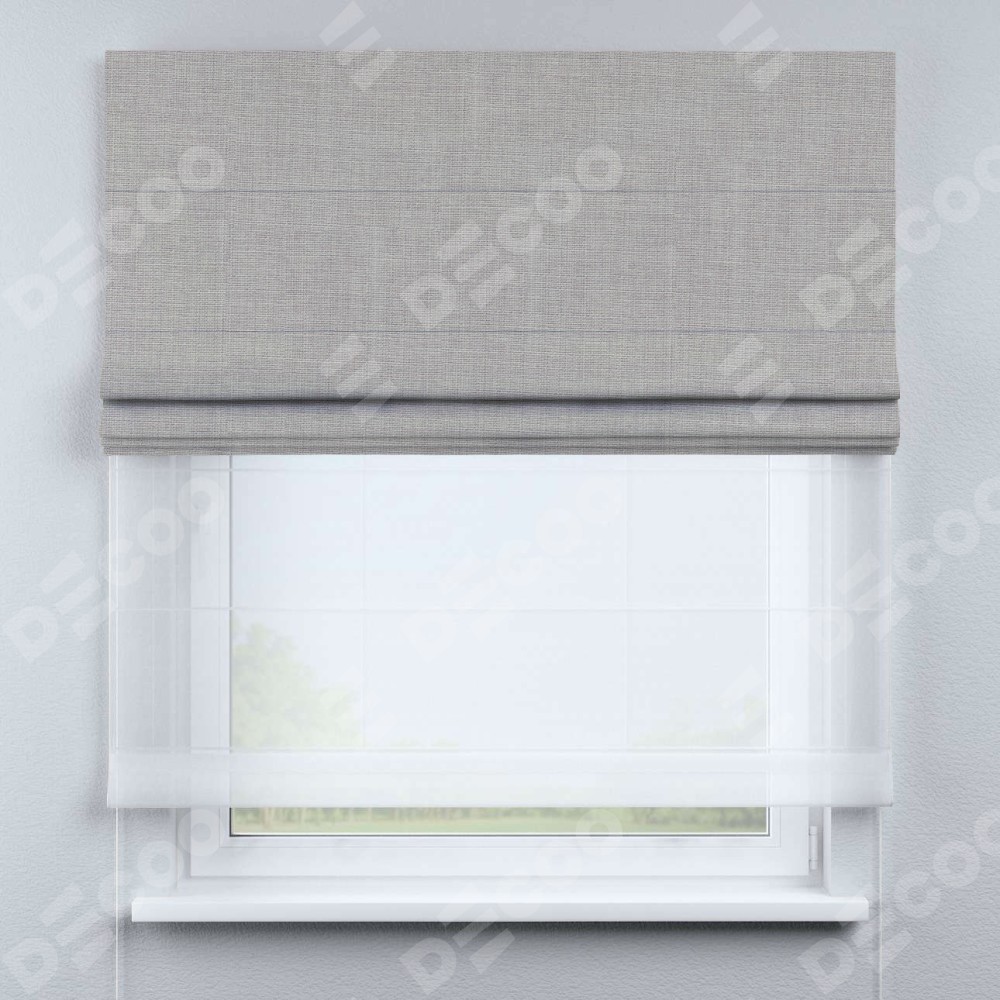 Двойная римская штора «День-ночь» от производителя Cortin предназначена для использования в проёмах. Эта штора уникальна тем, что состоит из двух полотен. На лицевой стороне находится лён серый (артикул: 91410), обеспечивающий эффективное затемнение. В комплект также входит вторая ткань — легкий белый тюль (артикул: V-01), который добавляет изящества и легкости оформлению окна. Кроме того, доступны и другие разновидности ткани тюль, выбор которых доступен по  ссылке .