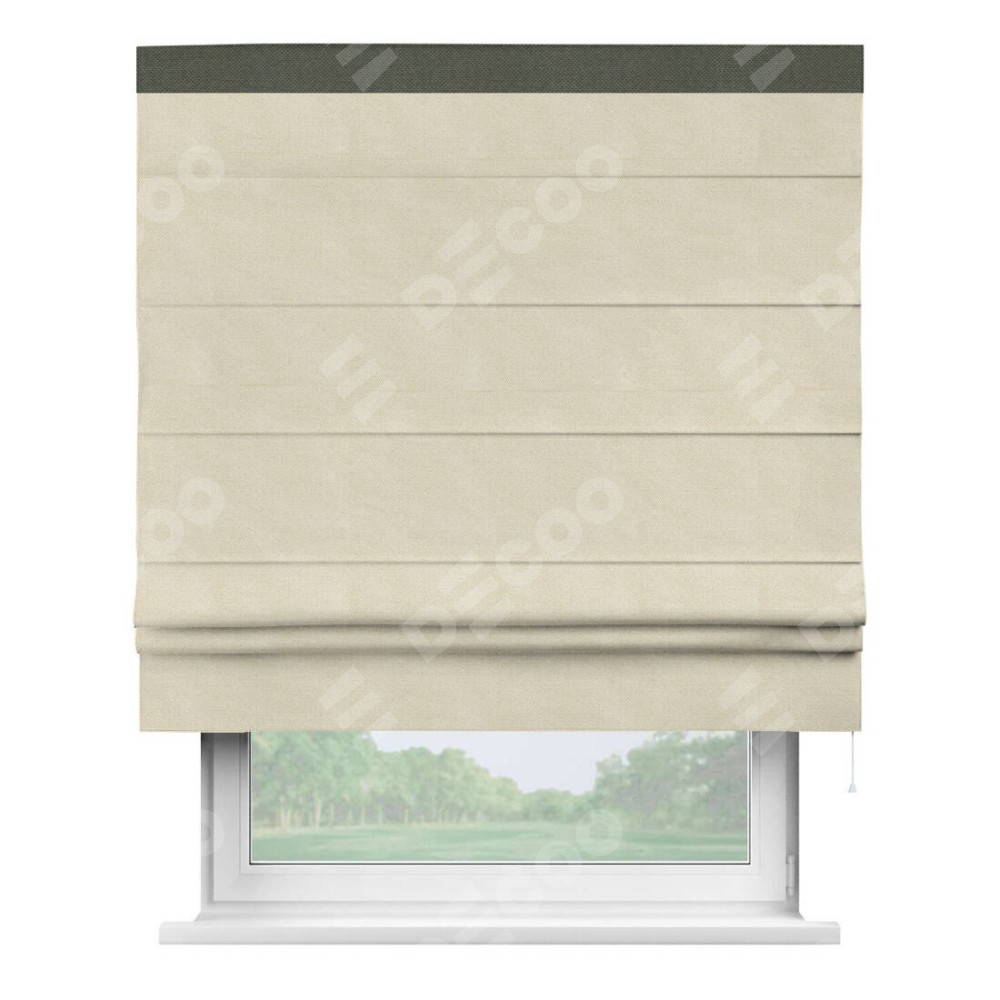 Римская штора производителя «Cortin», используется для проёма, пошита из ткани лён димаут бежевый, артикул 83023. Отделка шторы кантом «Кинг», ткань для канта используется из льна димаут разной расцветки на выбор. Имеет универсальный механизм и подходит для монтажа: на потолок, на стену и в нишу.