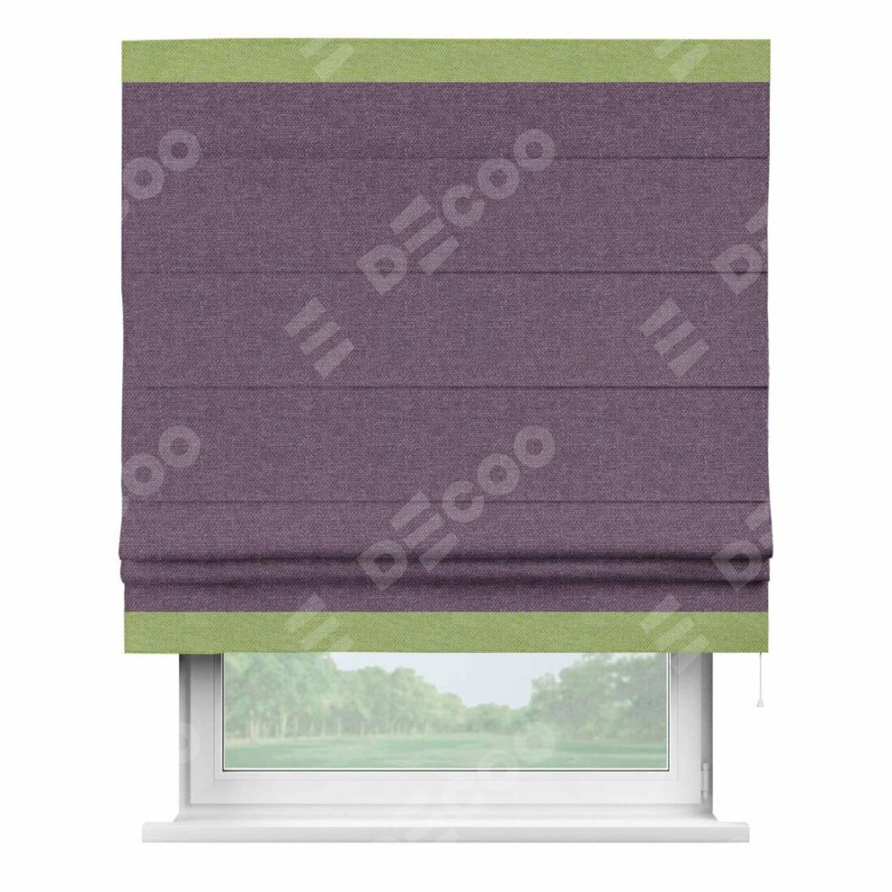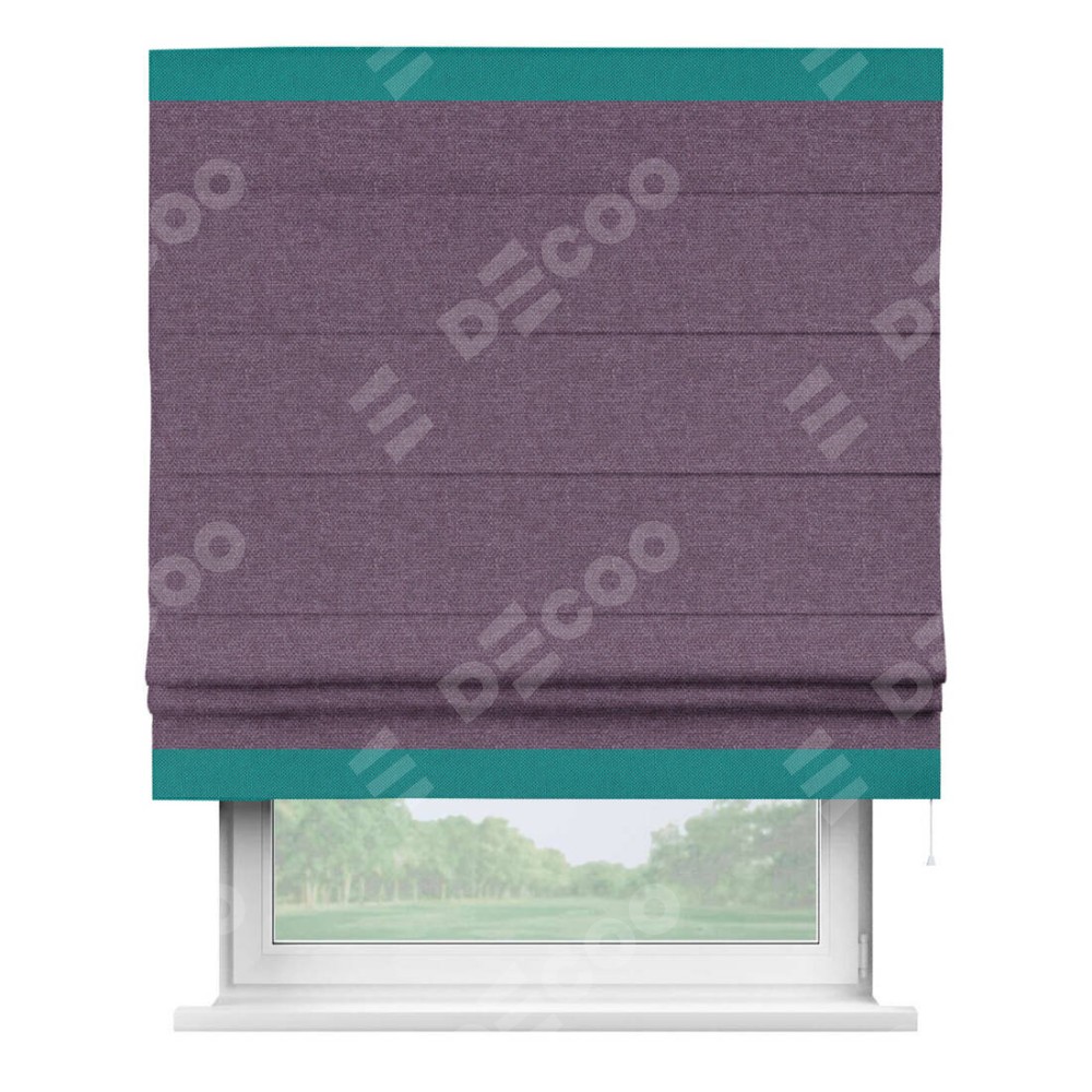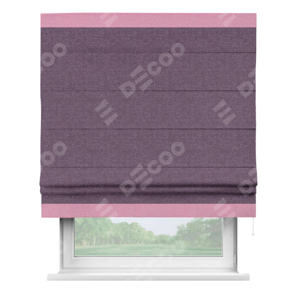 Римская штора производителя «Cortin», используется для проёма, пошита из ткани лён димаут брусника, артикул 16. Отделка шторы кантом «Горизонт», ткань для канта используется из льна димаут разной расцветки на выбор. Имеет универсальный механизм и подходит для монтажа: на потолок, на стену и в нишу.