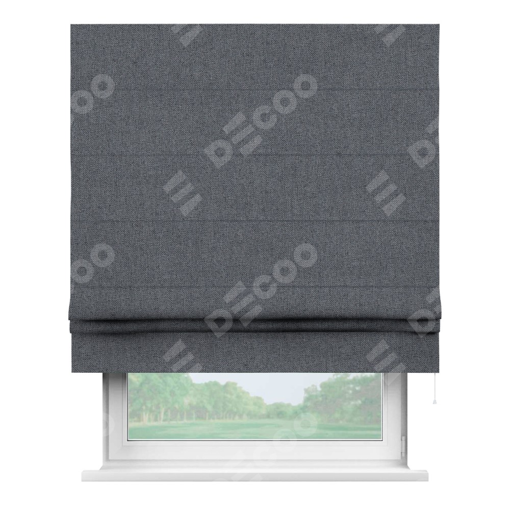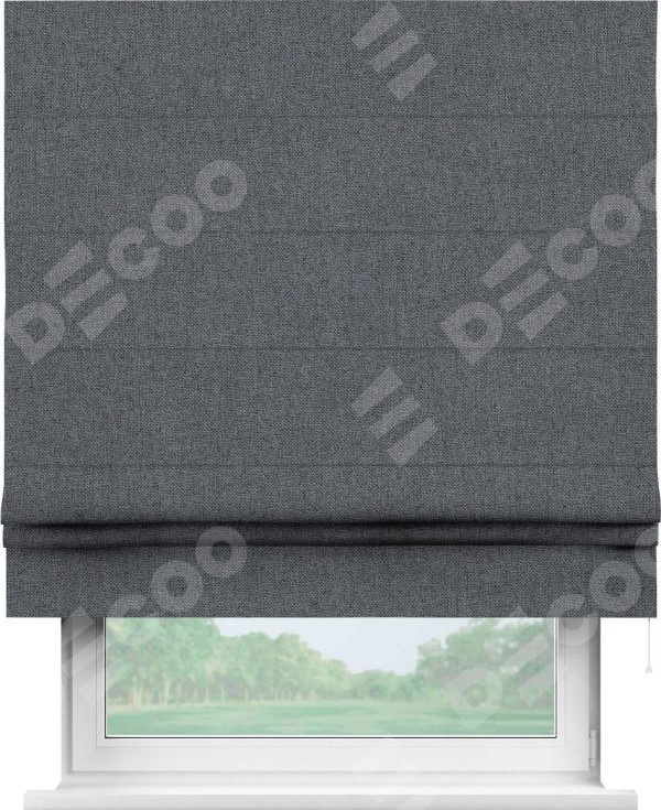 Классическая римская штора производителя «Cortin», пошита из ткани лён блэкаут тёмно-серый, артикул: 139663. Имеет универсальный механизм и подходит для монтажа: на потолок, на стену и в нишу.