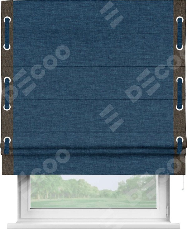 Римская штора «Кортин» для проёма, лён синий, с кантом Стрим Дуо (люверсы с пояском)