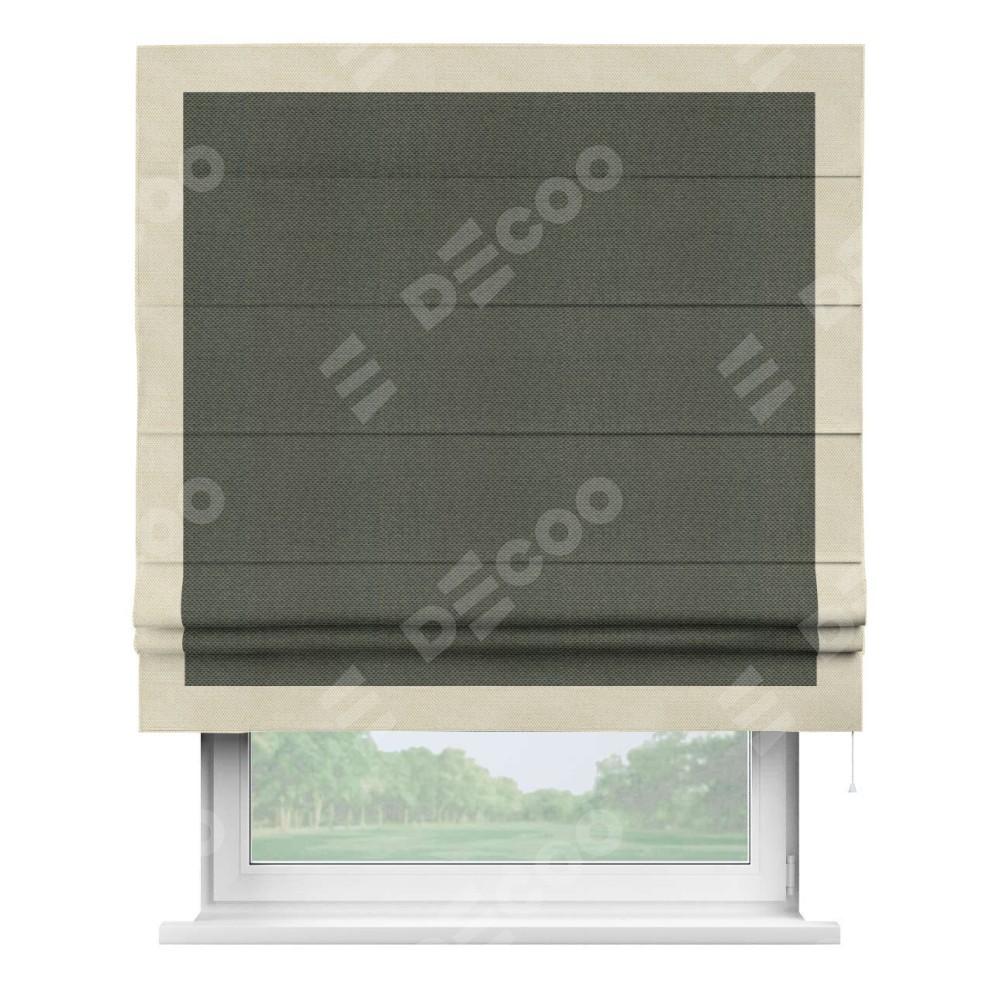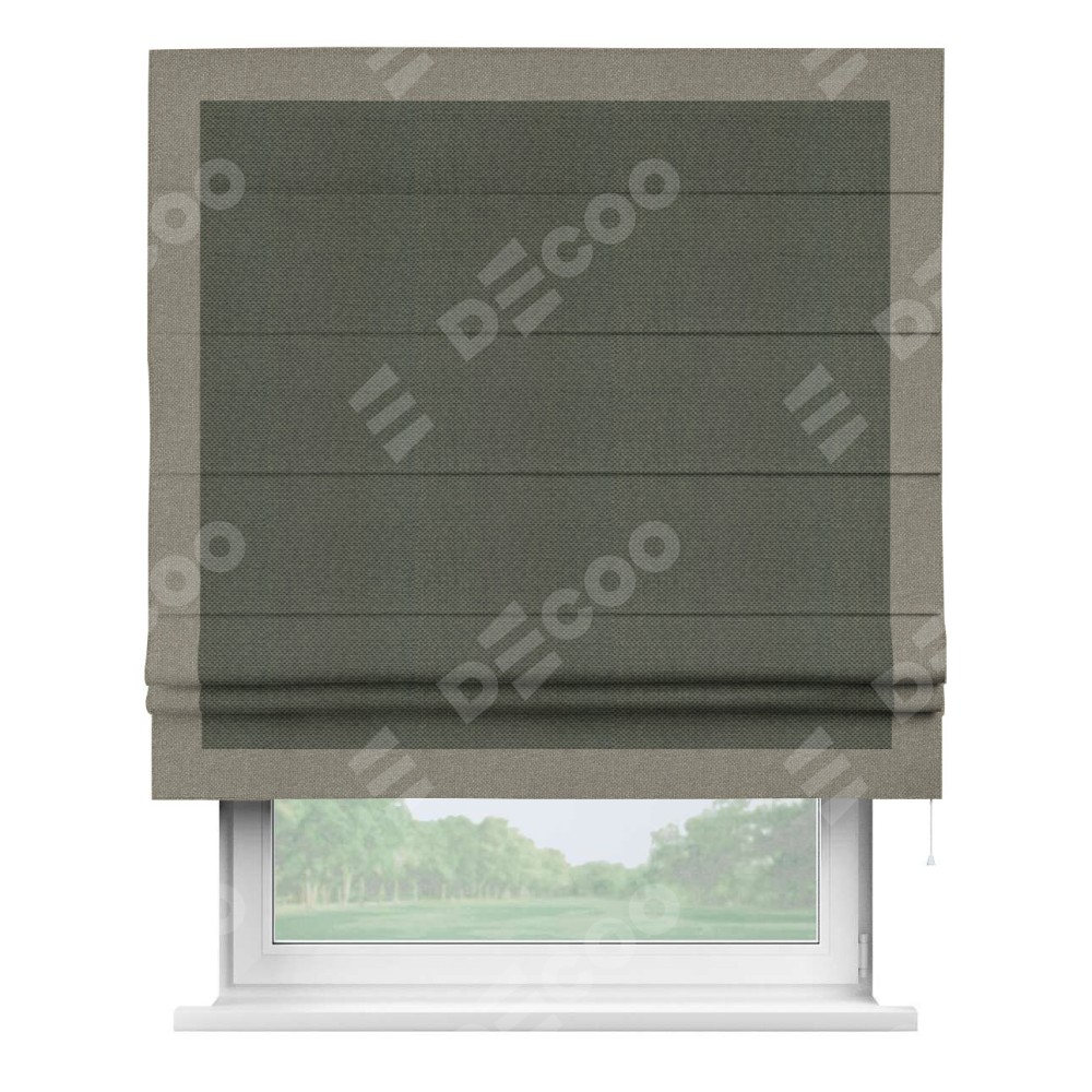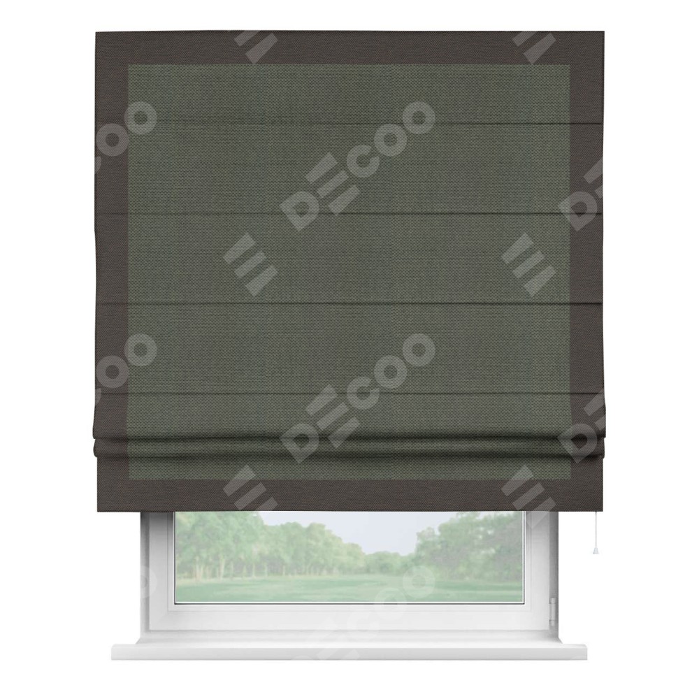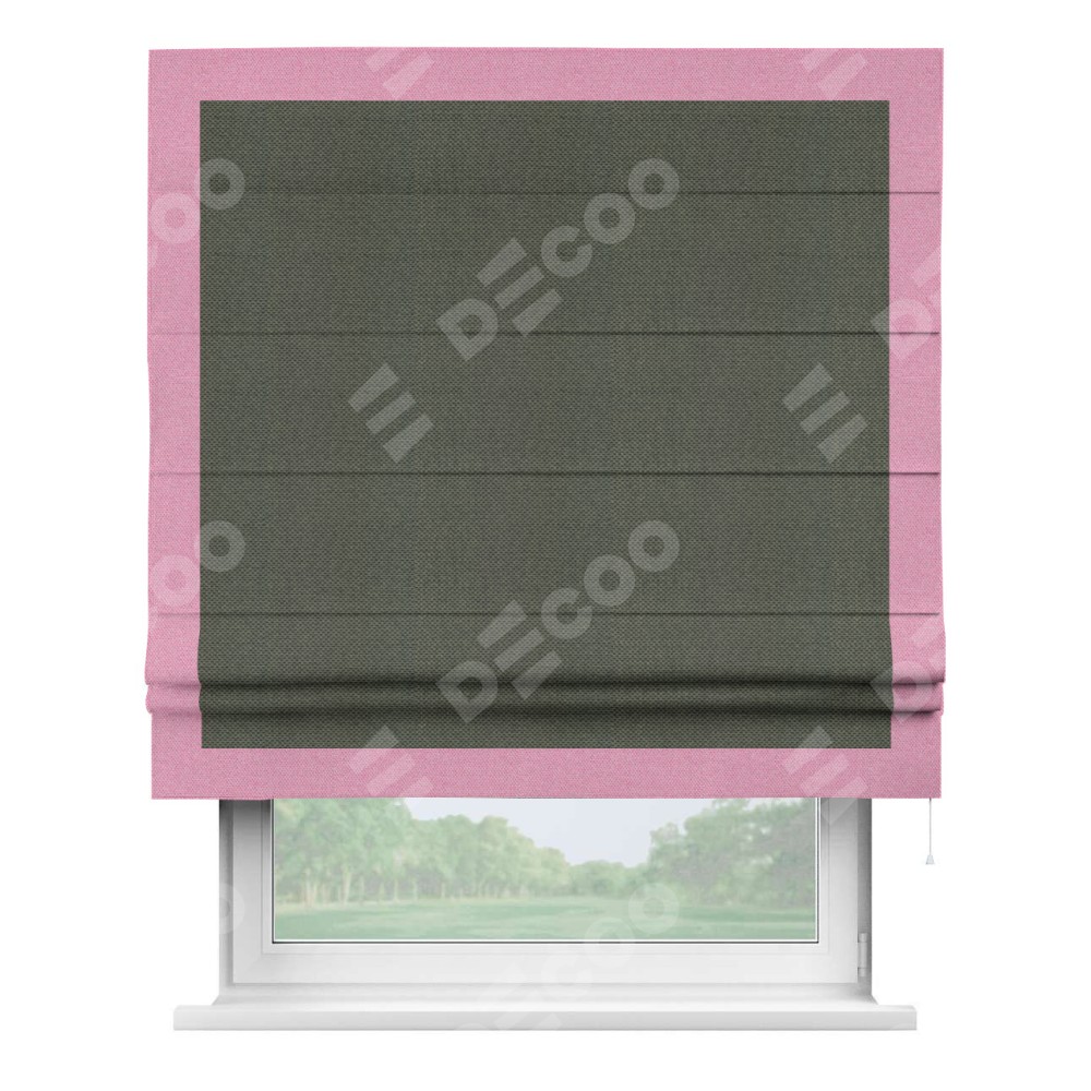 Римская штора производителя «Cortin», используется для проёма, пошита из ткани лён димаут графит, артикул 27. Отделка шторы кантом «Чесс», ткань для канта используется из льна димаут разной расцветки на выбор. Имеет универсальный механизм и подходит для монтажа: на потолок, на стену и в нишу.