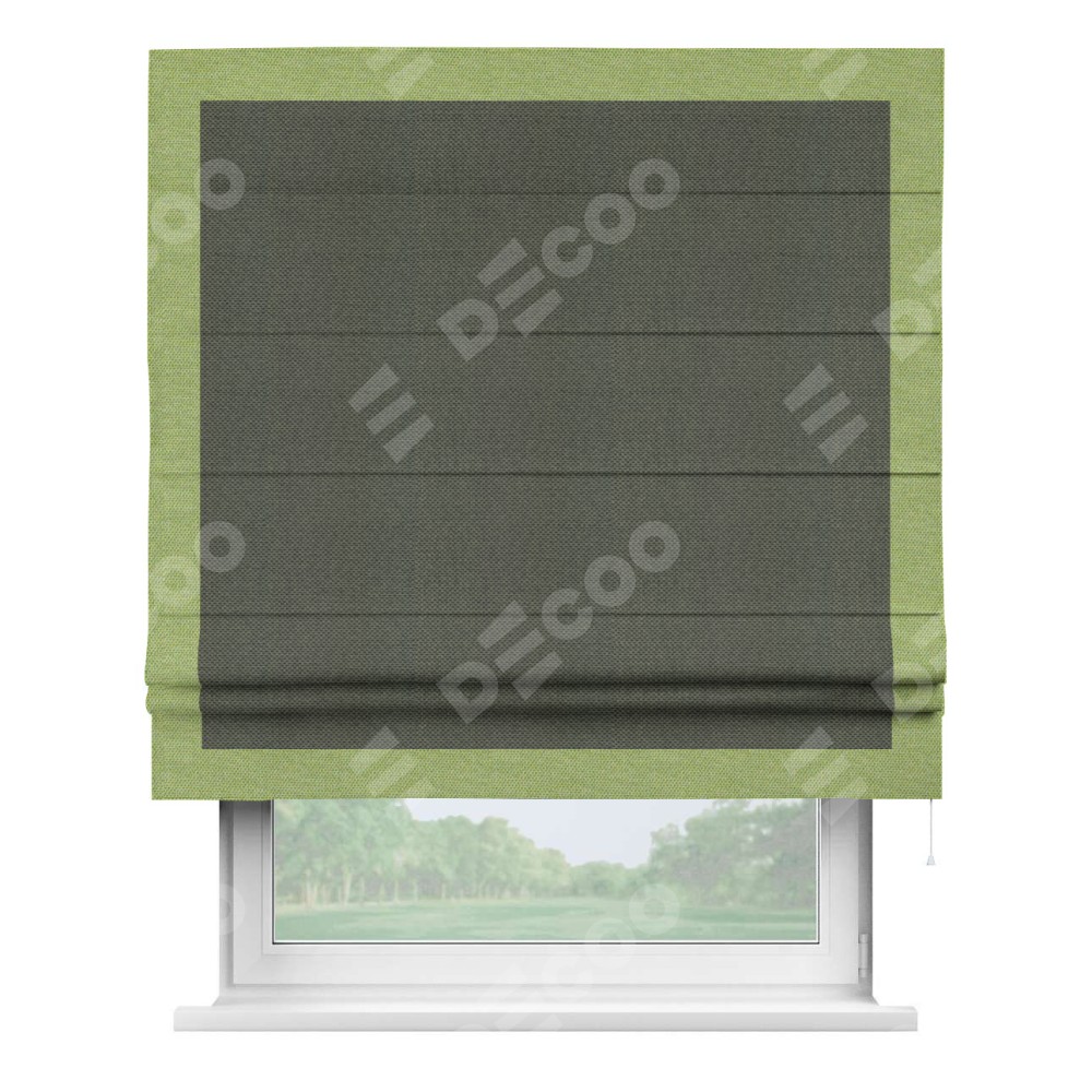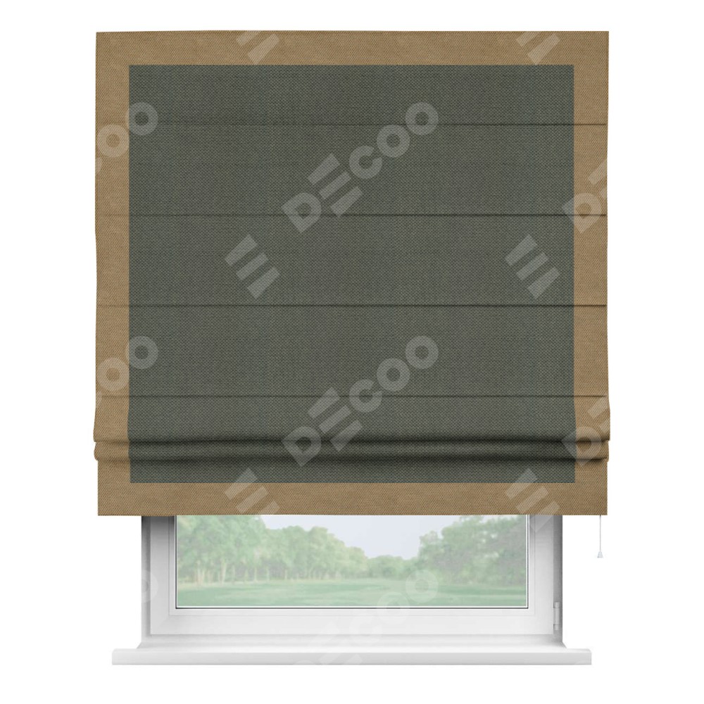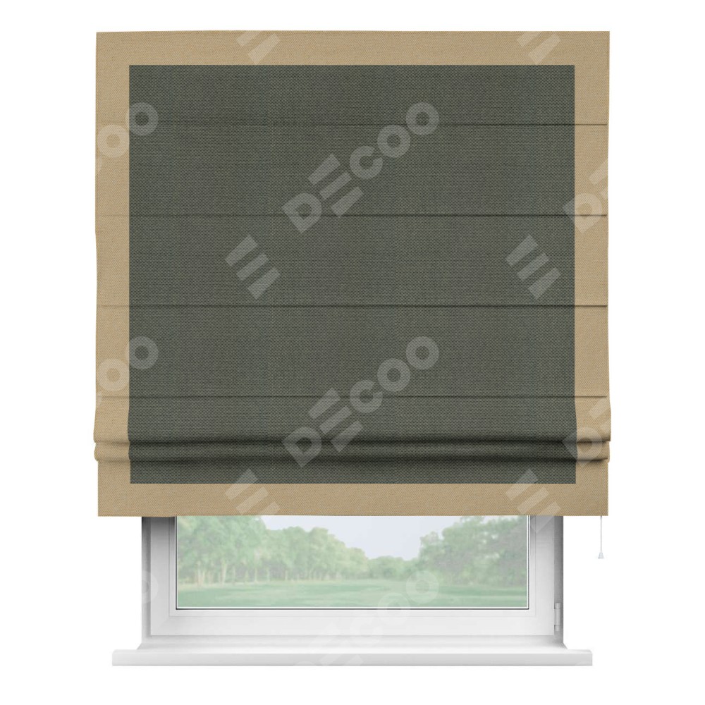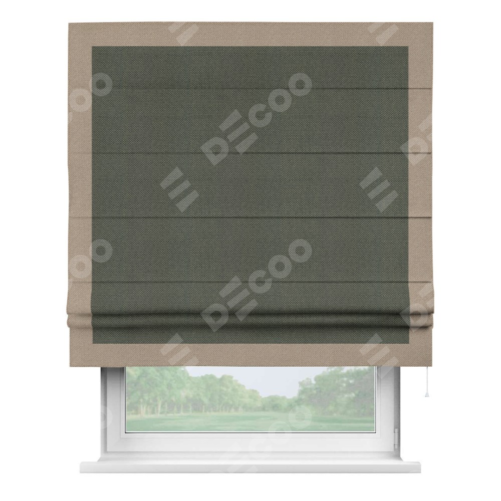 Римская штора производителя «Cortin», используется для проёма, пошита из ткани лён димаут графит, артикул 27. Отделка шторы кантом «Чесс», ткань для канта используется из льна димаут разной расцветки на выбор. Имеет универсальный механизм и подходит для монтажа: на потолок, на стену и в нишу.