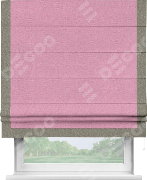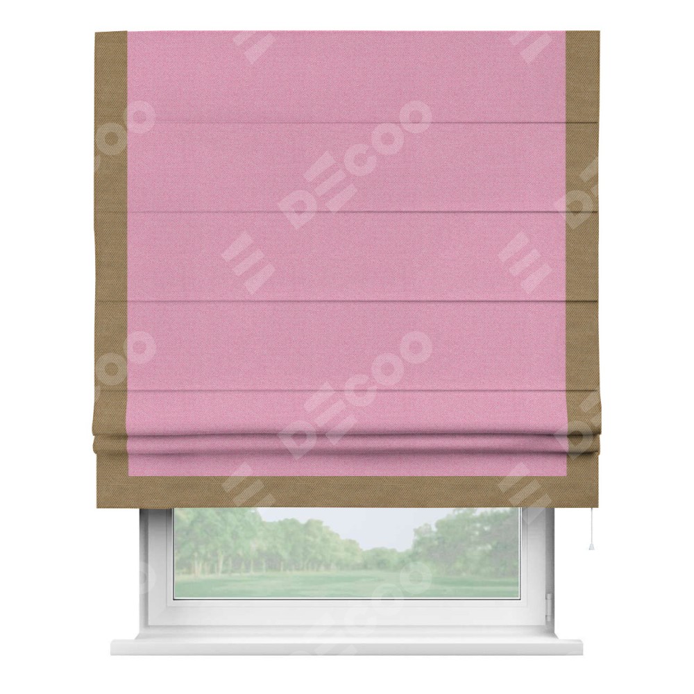Римская штора производителя «Cortin», используется для проёма, пошита из ткани лён димаут розовый, артикул 16257. Отделка шторы кантом «Виктория», ткань для канта используется из льна димаут разной расцветки на выбор. Имеет универсальный механизм и подходит для монтажа: на потолок, на стену и в нишу.