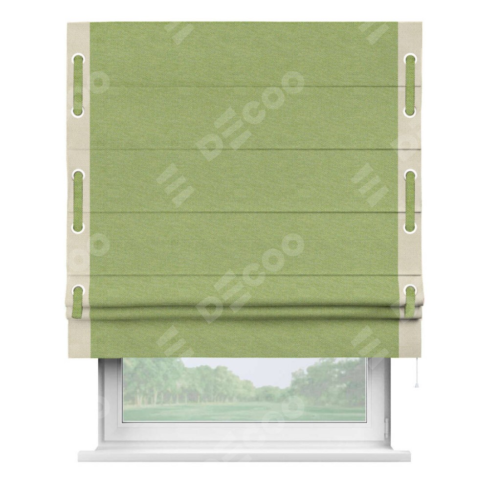 Римская штора производителя «Cortin», используется для проёма, пошита из ткани лён димаут салатовый, артикул 83032. Отделка шторы кантом «Стрим Дуо» на кантах расположены люверсы с пояском, ткань для канта используется лён димаут разной расцветки на выбор. Ткань для пояска обычно используется из основной ткани шторы, а так же можно сделать из любой расцветки по желанию. Имеет универсальный механизм и подходит для монтажа: на потолок, на стену и в нишу.