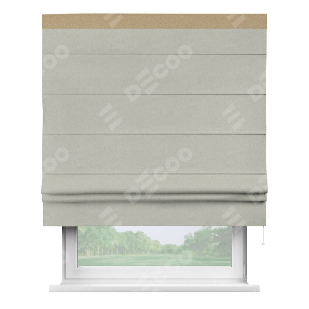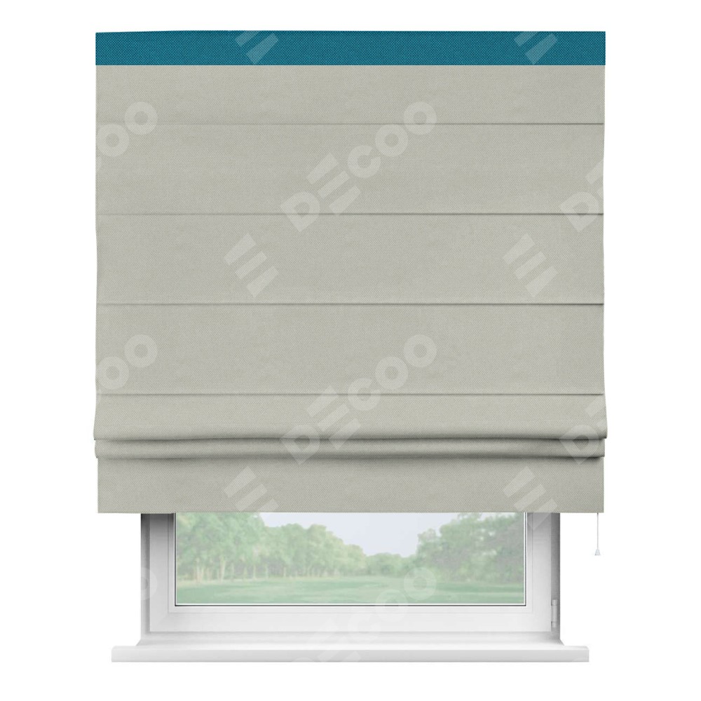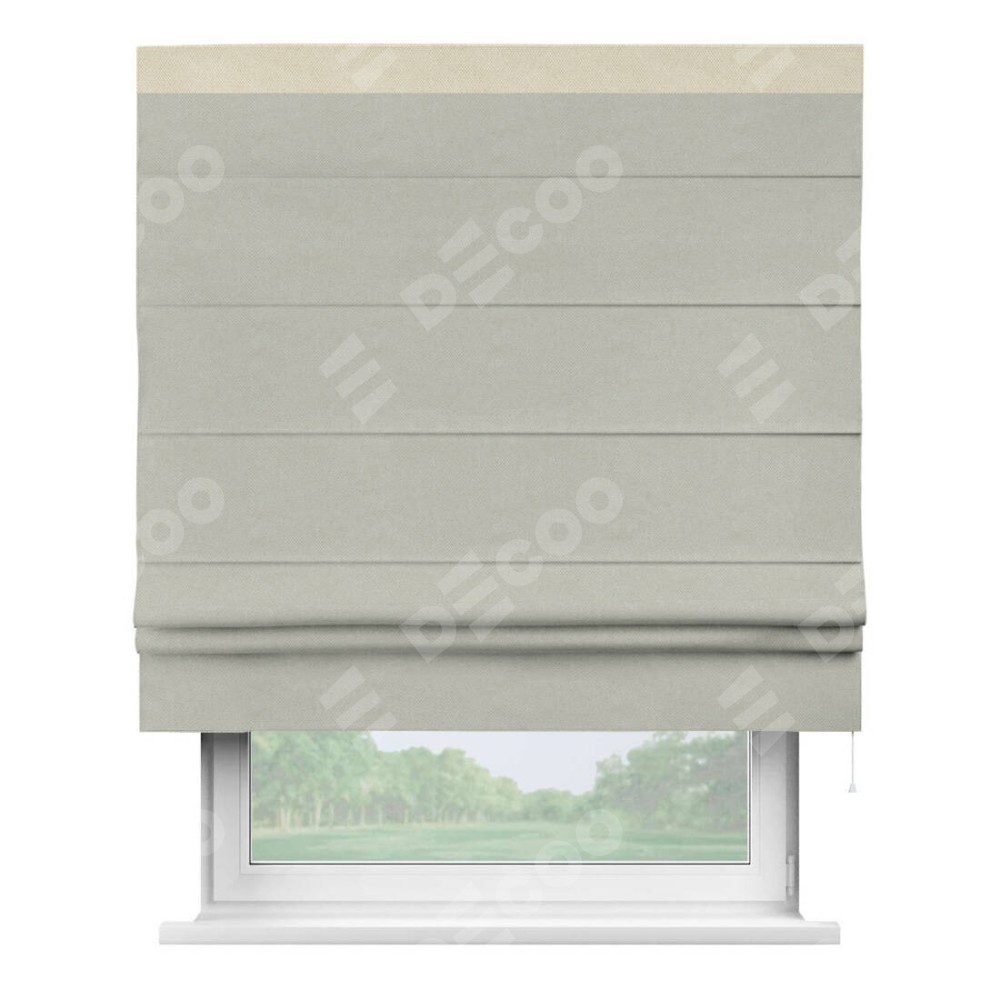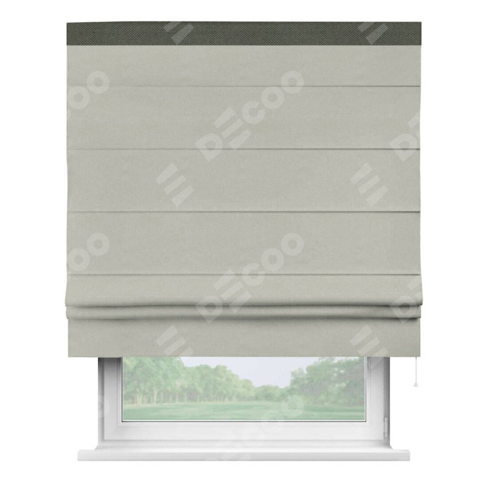 Римская штора производителя «Cortin», используется для проёма, пошита из ткани лён димаут светло-серый, артикул 83025. Отделка шторы кантом «Кинг», ткань для канта используется из льна димаут разной расцветки на выбор. Имеет универсальный механизм и подходит для монтажа: на потолок, на стену и в нишу.