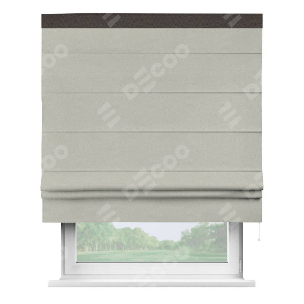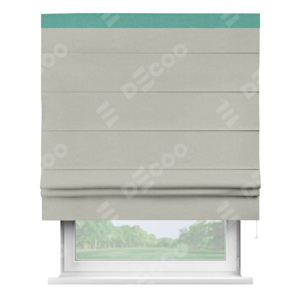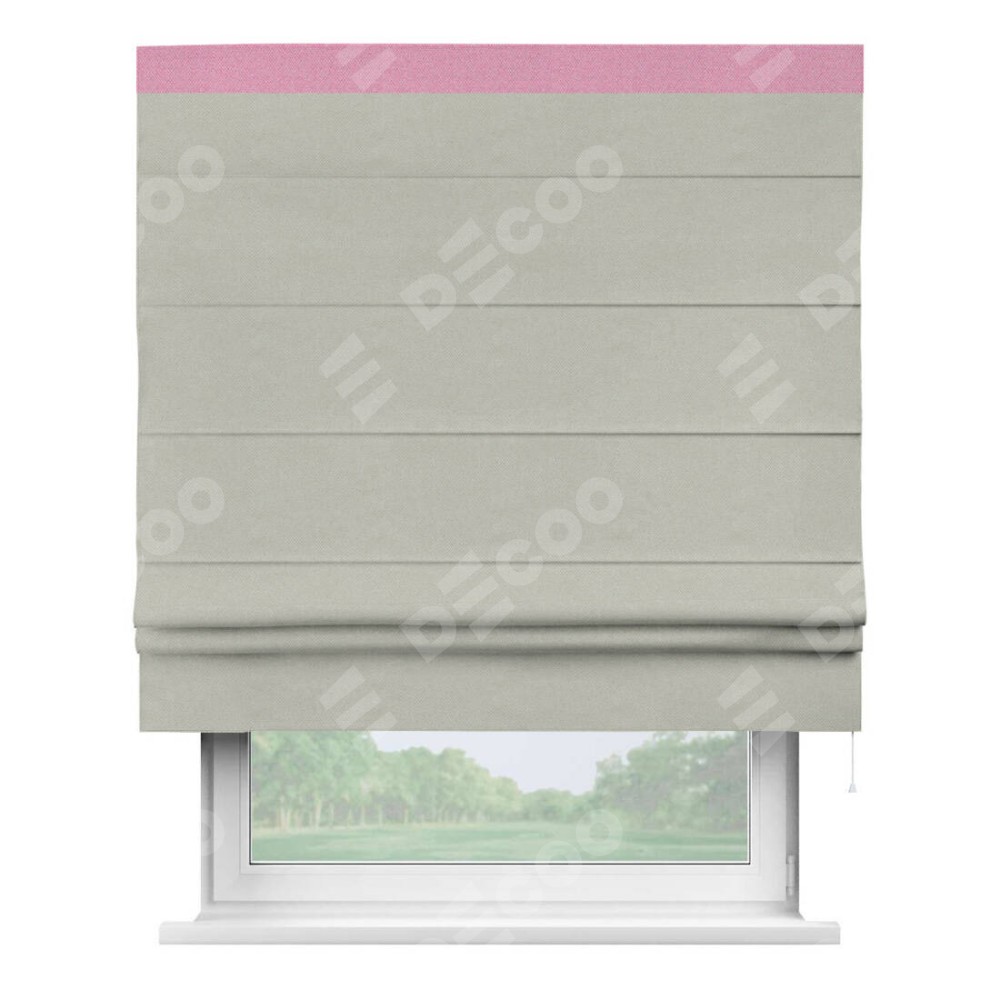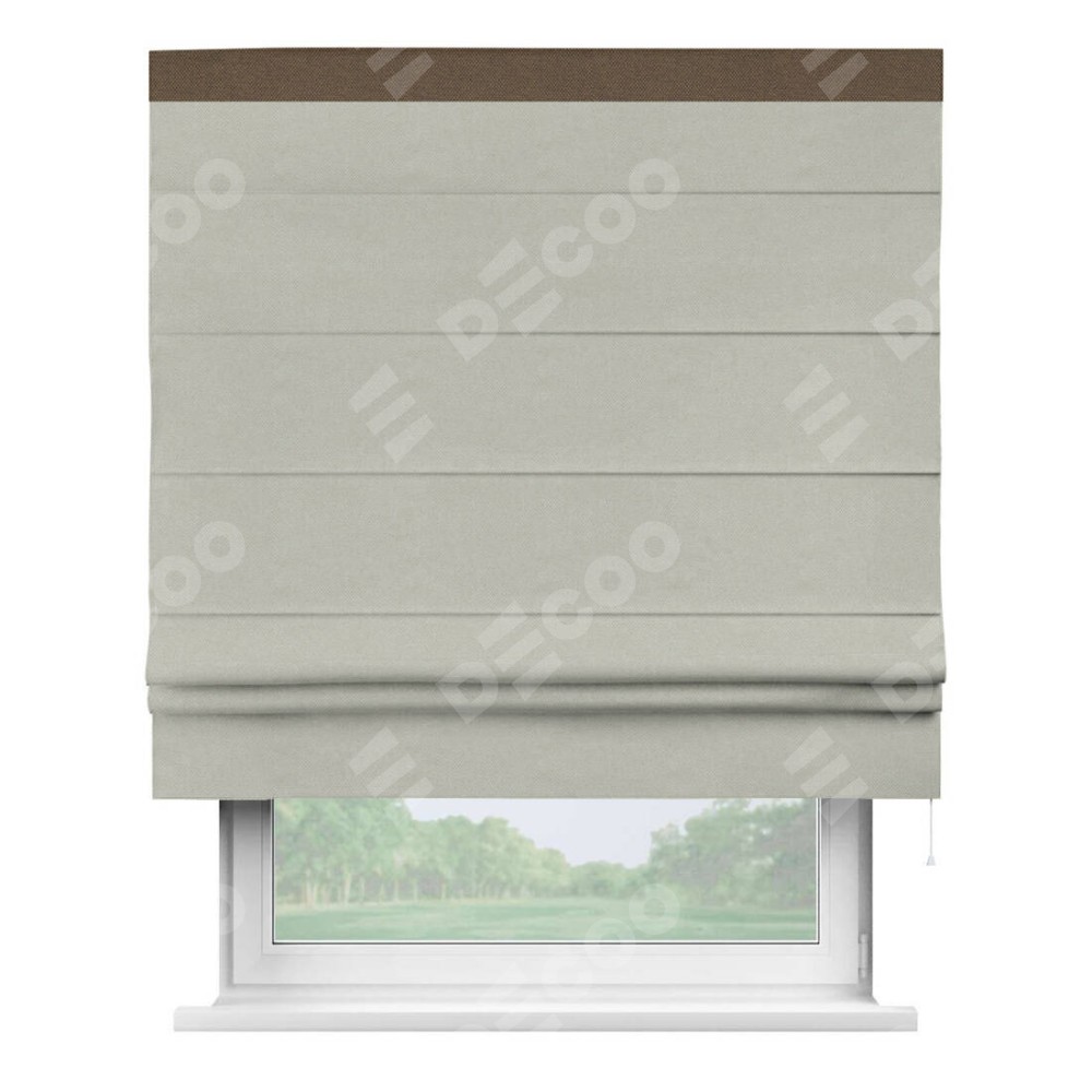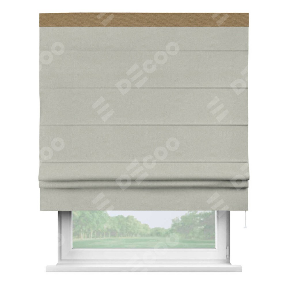 Римская штора производителя «Cortin», используется для проёма, пошита из ткани лён димаут светло-серый, артикул 83025. Отделка шторы кантом «Кинг», ткань для канта используется из льна димаут разной расцветки на выбор. Имеет универсальный механизм и подходит для монтажа: на потолок, на стену и в нишу.