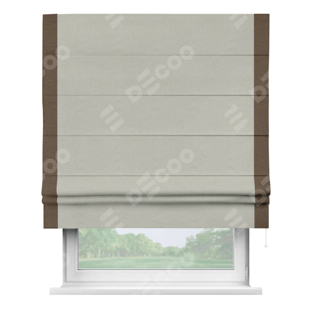 Римская штора производителя «Cortin», используется для проёма, пошита из ткани лён димаут светло-серый, артикул 83025. Отделка шторы кантом «Стрим Дуо», ткань для канта используется из льна димаут разной расцветки на выбор. Имеет универсальный механизм и подходит для монтажа: на потолок, на стену и в нишу.