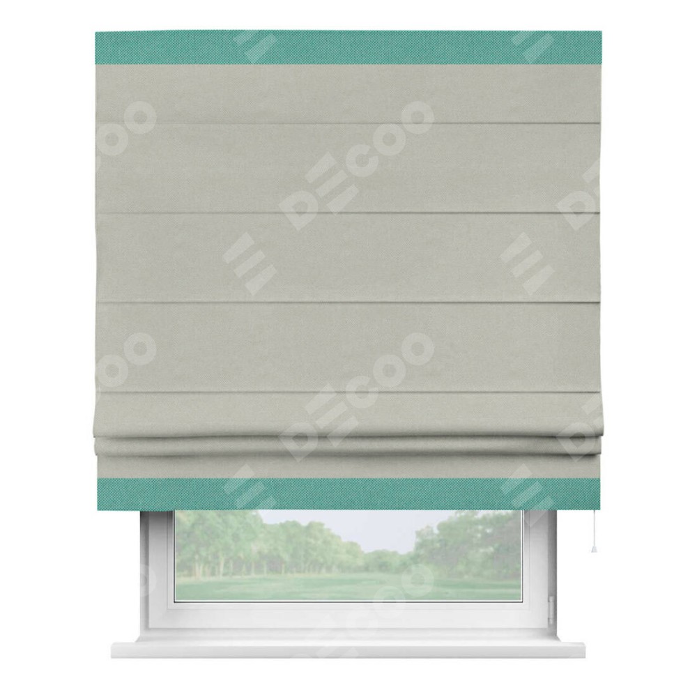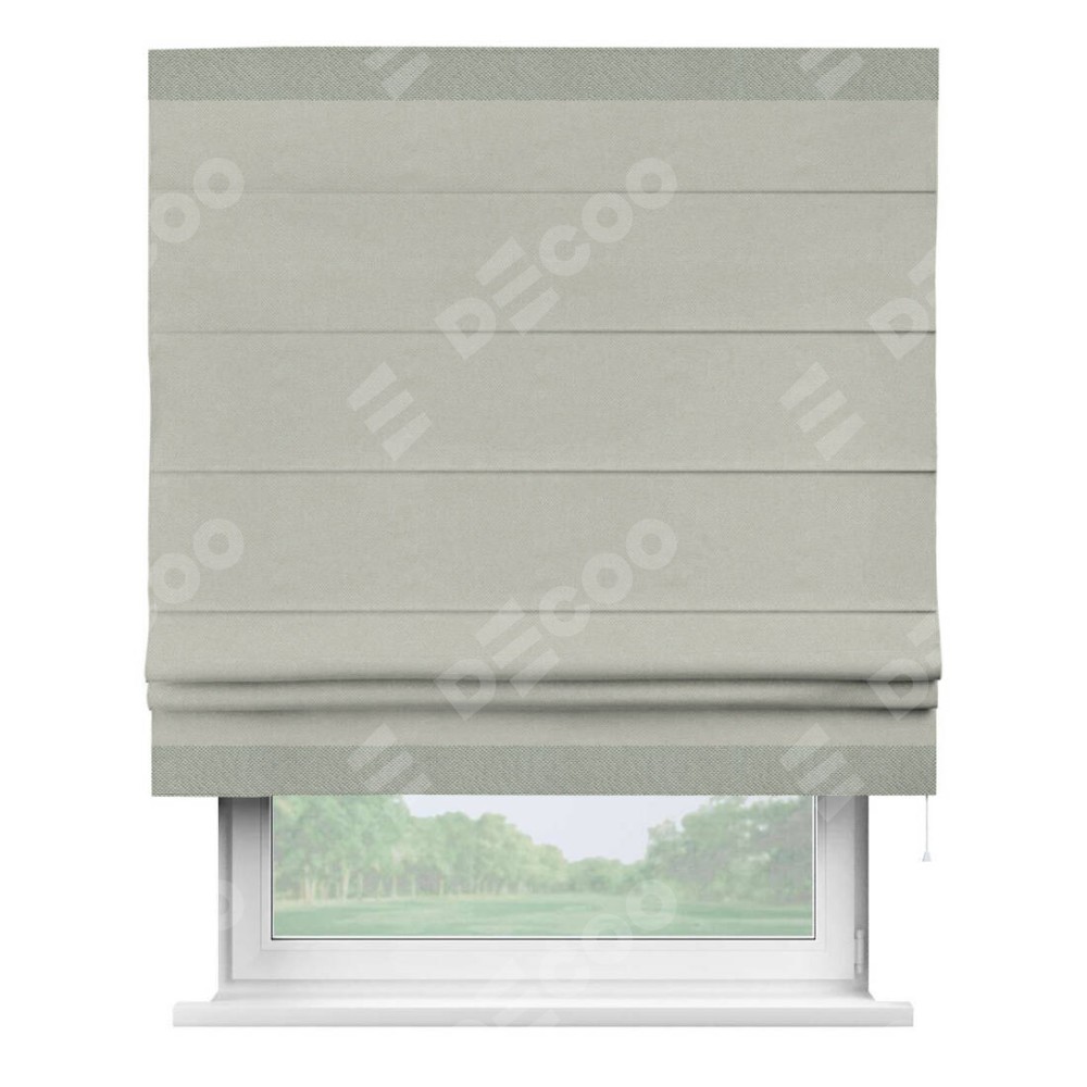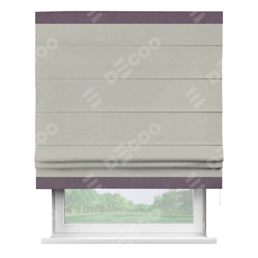 Римская штора производителя «Cortin», используется для проёма, пошита из ткани лён димаут светло-серый, артикул 83025. Отделка шторы кантом «Горизонт», ткань для канта используется из льна димаут разной расцветки на выбор. Имеет универсальный механизм и подходит для монтажа: на потолок, на стену и в нишу.