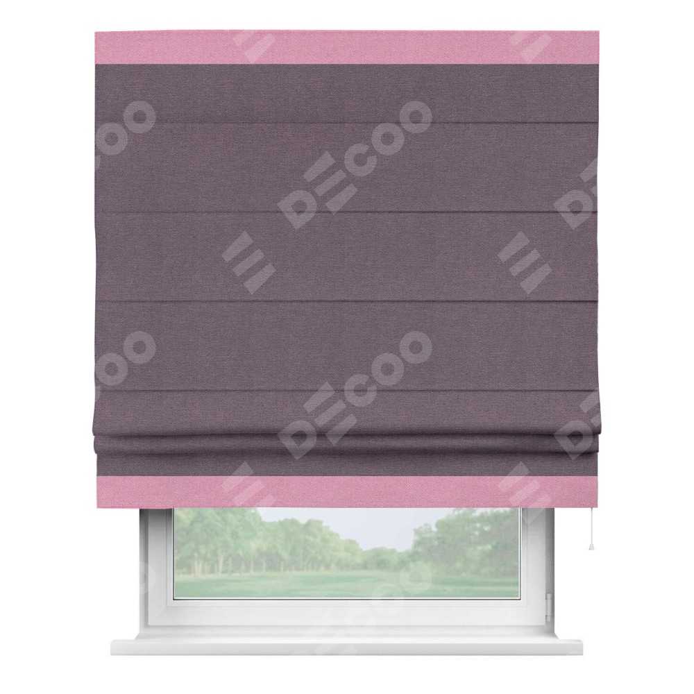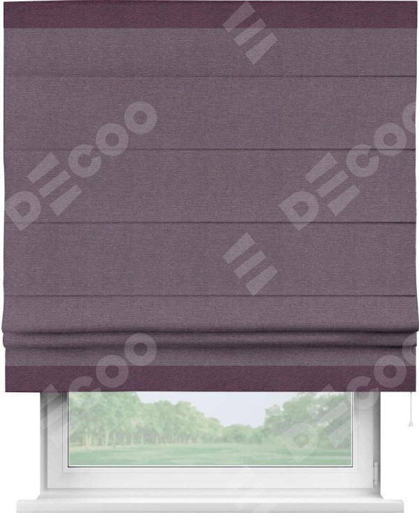 Римская штора производителя «Cortin», используется для проёма, пошита из ткани лён димаут светло-фиолетовый, артикул 83034. Отделка шторы кантом «Горизонт», ткань для канта используется из льна димаут разной расцветки на выбор. Имеет универсальный механизм и подходит для монтажа: на потолок, на стену и в нишу.