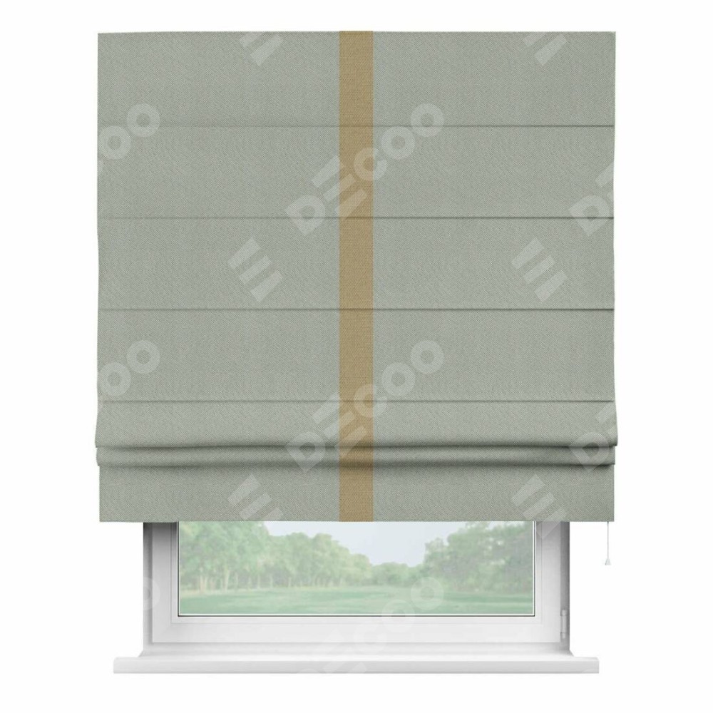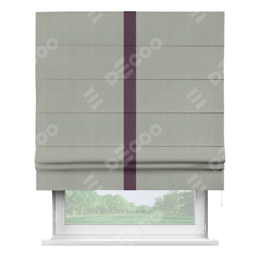 Римская штора производителя «Cortin», используется для проёма, пошита из ткани лён димаут серый, артикул ф3. Отделка шторы кантом «Хайвэй», ткань для канта используется из льна димаут разной расцветки на выбор. Имеет универсальный механизм и подходит для монтажа: на потолок, на стену и в нишу.