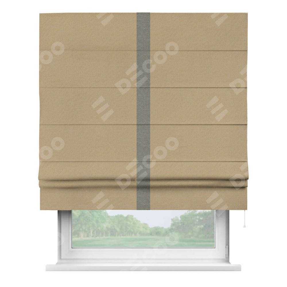 Римская штора производителя «Cortin», используется для проёма, пошита из ткани лён димаут тёмно-бежевый, артикул 83 037. Отделка шторы кантом «Хайвэй», ткань для канта используется из льна димаут разной расцветки на выбор. Имеет универсальный механизм и подходит для монтажа: на потолок, на стену и в нишу.