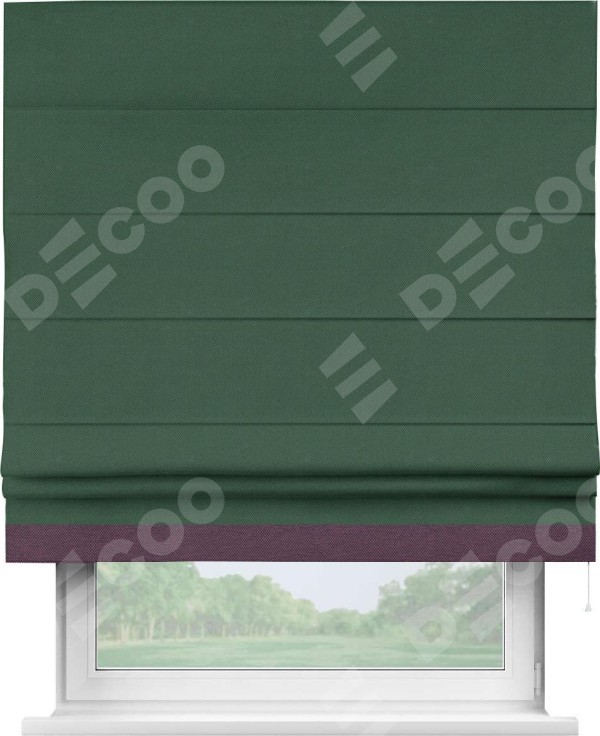 Римская штора производителя «Cortin», используется для проёма, пошита из ткани лён димаут тёмно-зелёный, артикул 16246. Отделка шторы кантом «Джестер», ткань для канта используется из льна димаут разной расцветки на выбор. Имеет универсальный механизм и подходит для монтажа: на потолок, на стену и в нишу.