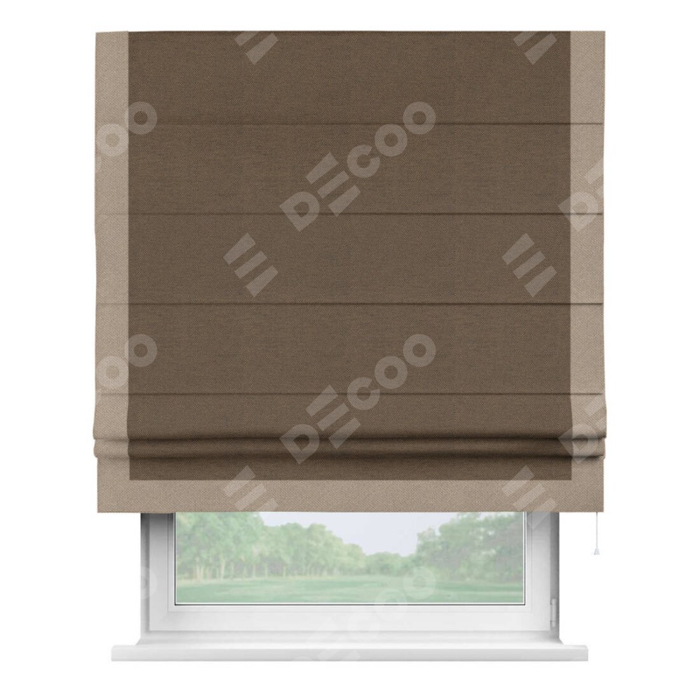 Римская штора производителя «Cortin», используется для проёма, пошита из ткани лён димаут тёмно-коричневый, артикул 83030. Отделка шторы кантом «Виктория», ткань для канта используется из льна димаут разной расцветки на выбор. Имеет универсальный механизм и подходит для монтажа: на потолок, на стену и в нишу.